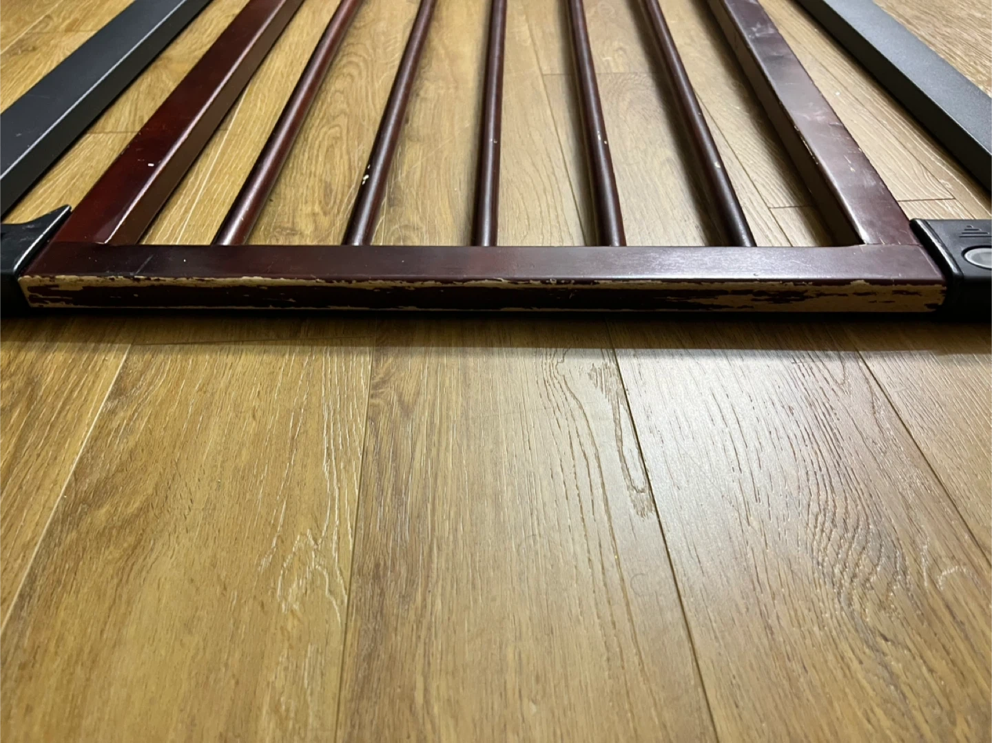 This is a Munchkin wooden baby gate with dark brown wooden slats and black metal framing. It's designed to keep little ones safe. Some wear and tear on the wood finish.