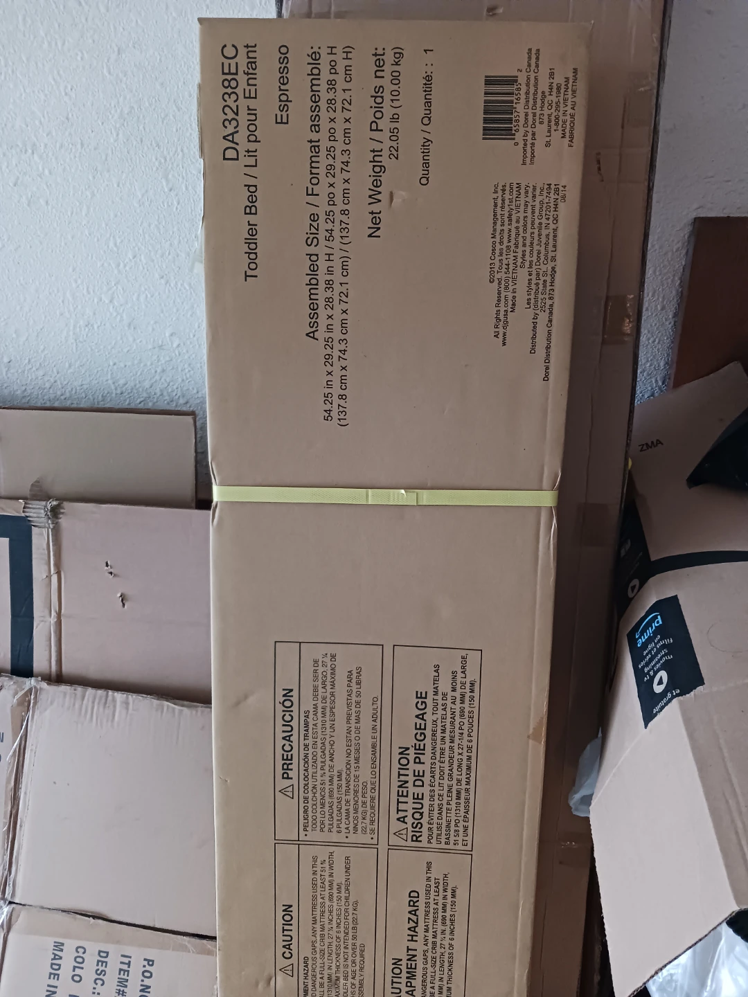 Brand new, Never opened toddler bed. This is a Dorel Espresso toddler bed. Assembled dimensions are 54.25 in L x 29.25 in W x 28.38 in H (137.8 cm x 74.3 cm x 72.1 cm H). Net weight is 22.05 lb (10.00 kg). It's designed for toddlers over 15 months.