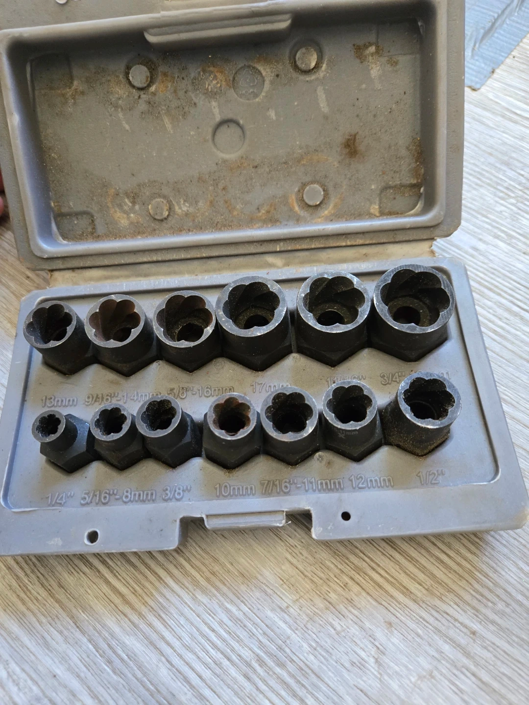 This is a 13-piece impact bolt extractor set. It includes various sizes in both imperial and metric measurements. It's designed for removing damaged or stripped bolts. 3/8-in Drive Impact Bolt Extractor Set, 13-pc, $40.00 pick up only Trenton.