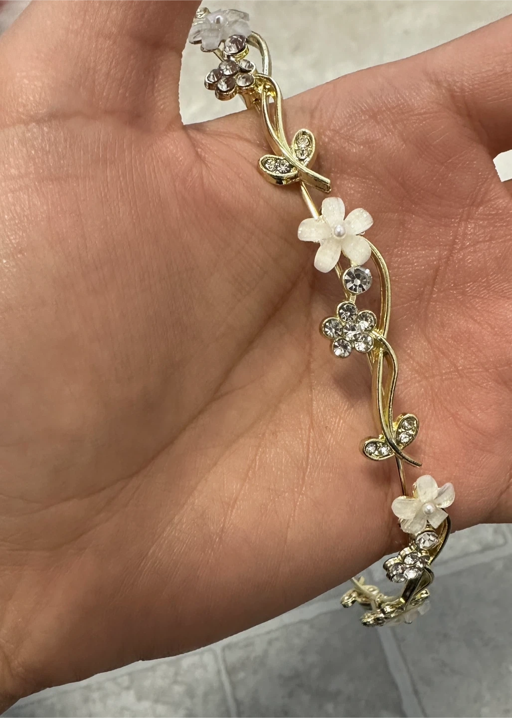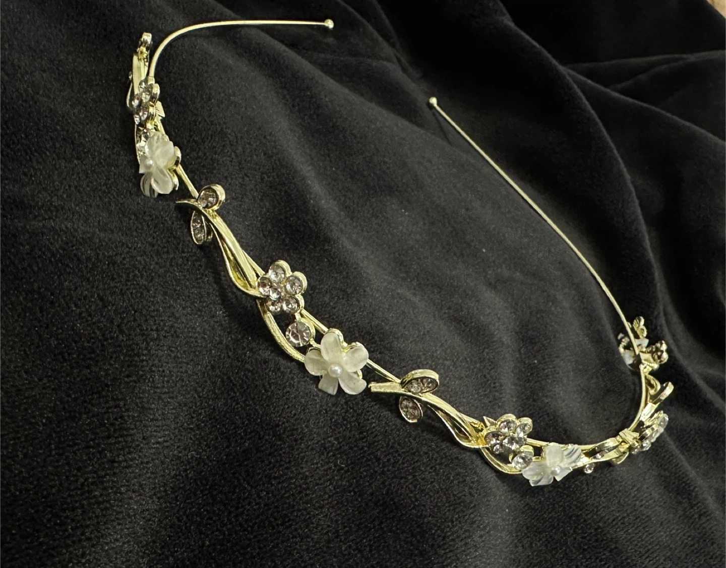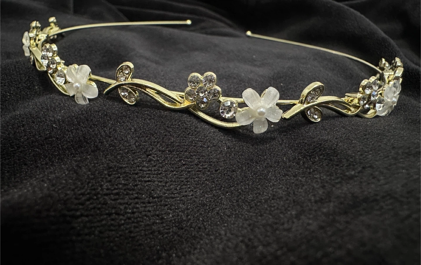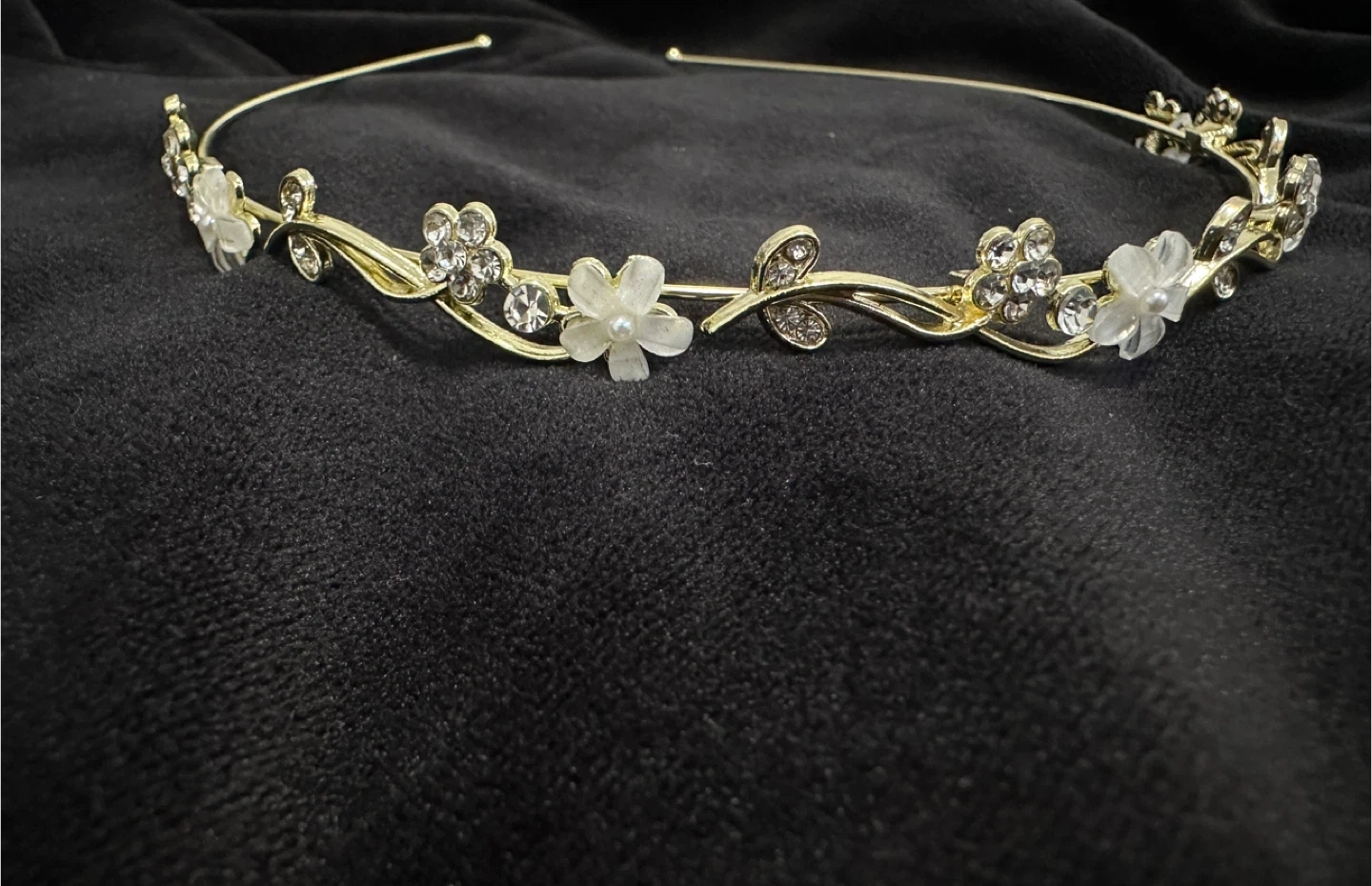 A beautiful gold-toned headband adorned with delicate floral accents and sparkling rhinestones. It features small pearl centres on the flowers and a flowing vine design. This tiara is perfect for special occasions or adding a touch of elegance.