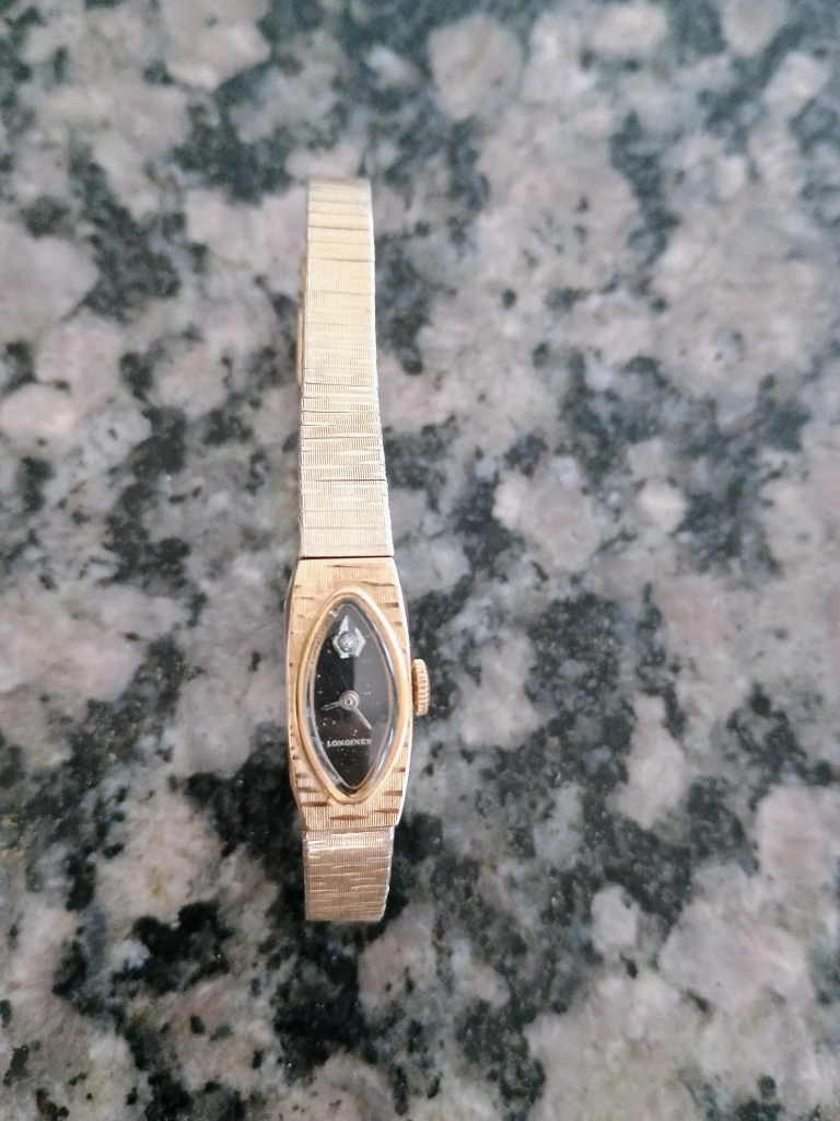Vintage Longines ladies watch. It has a gold-tone finish and a unique oval face. Perfect for adding a touch of vintage elegance to your style!