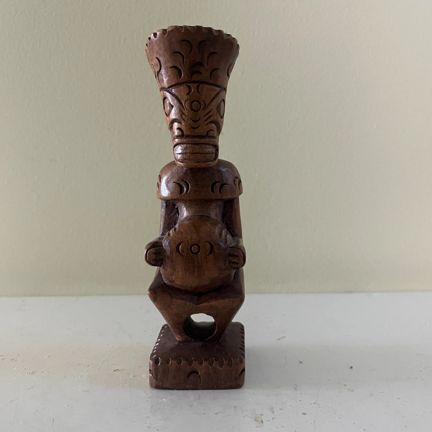 Hand-carved Polynesian hardwood tiki statue. Measures approximately 8 inches tall.