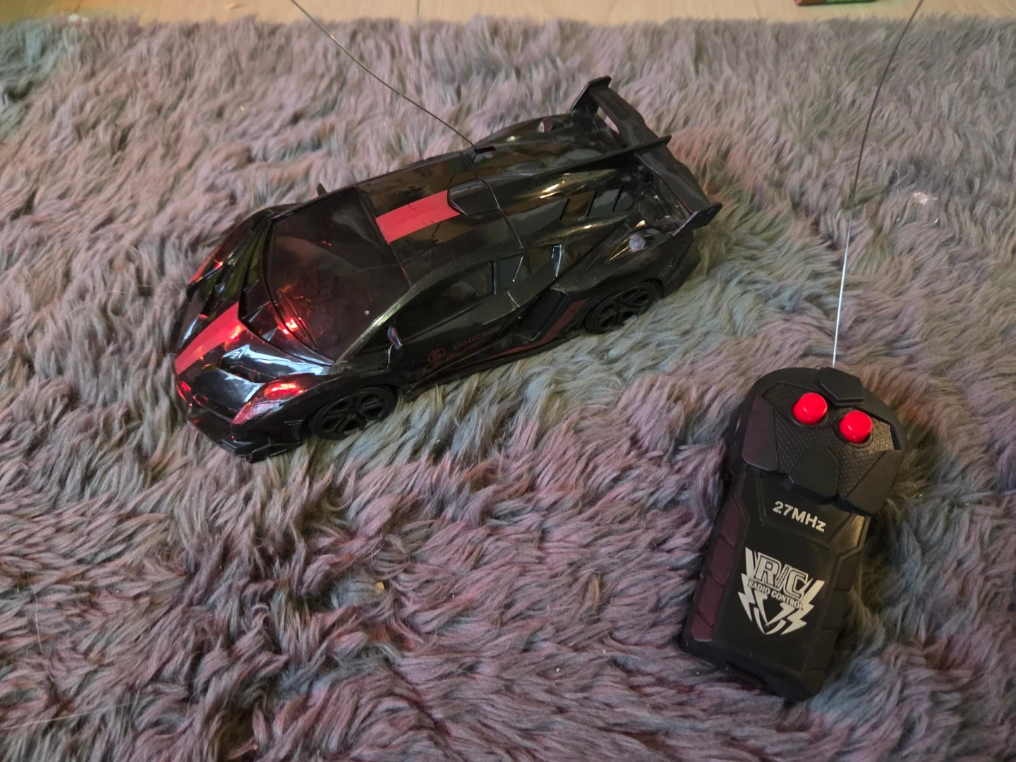 This is a remote control race car. It's black with red racing stripes. Includes a 27MHz radio control remote.