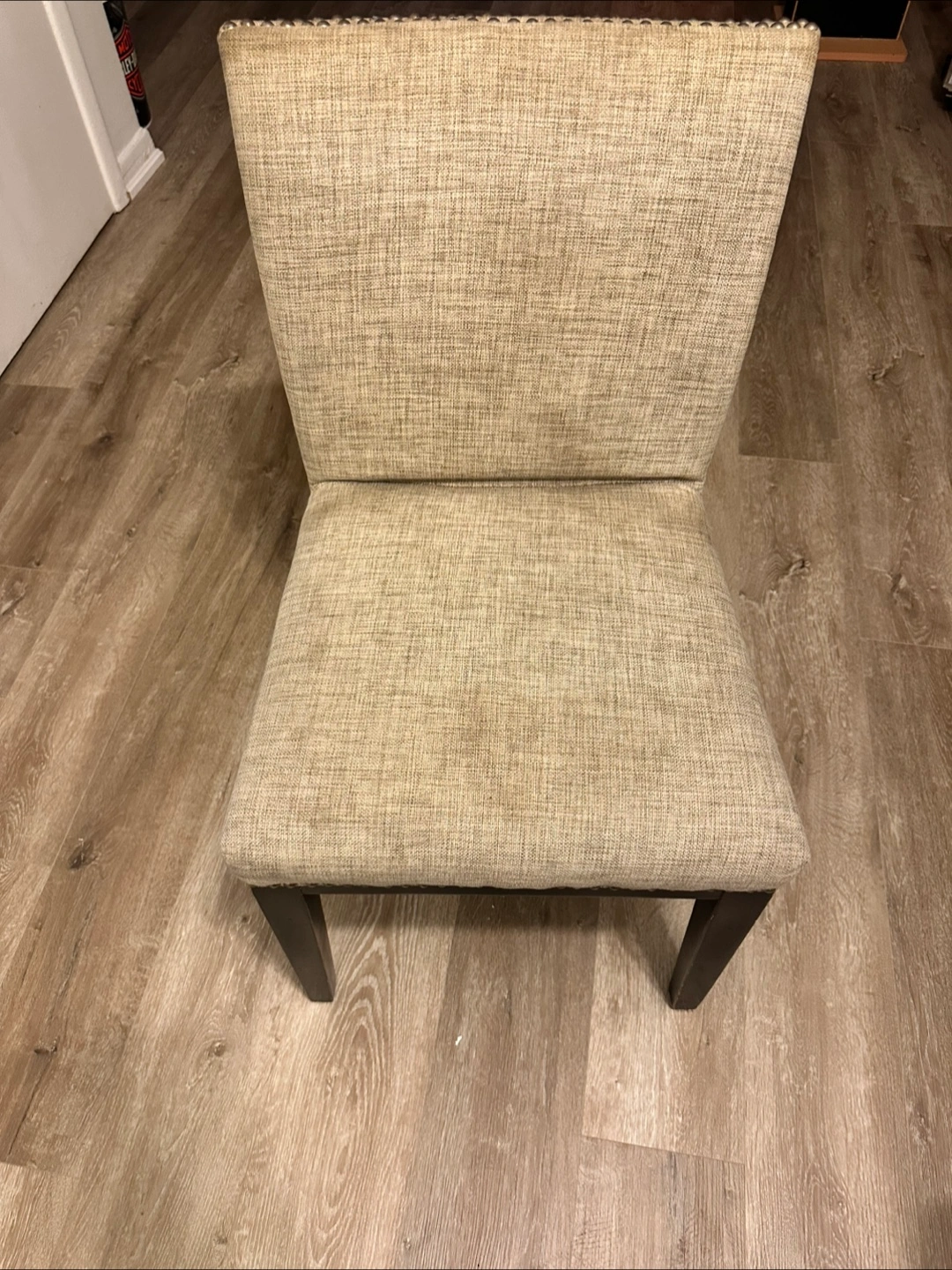 Selling a dining table with a glass top and six chairs. The chairs are upholstered with a neutral-toned fabric and have decorative nailhead trim. The table frame is a dark metal. Only 5 matching chairs. Take as is. The glass top is removable