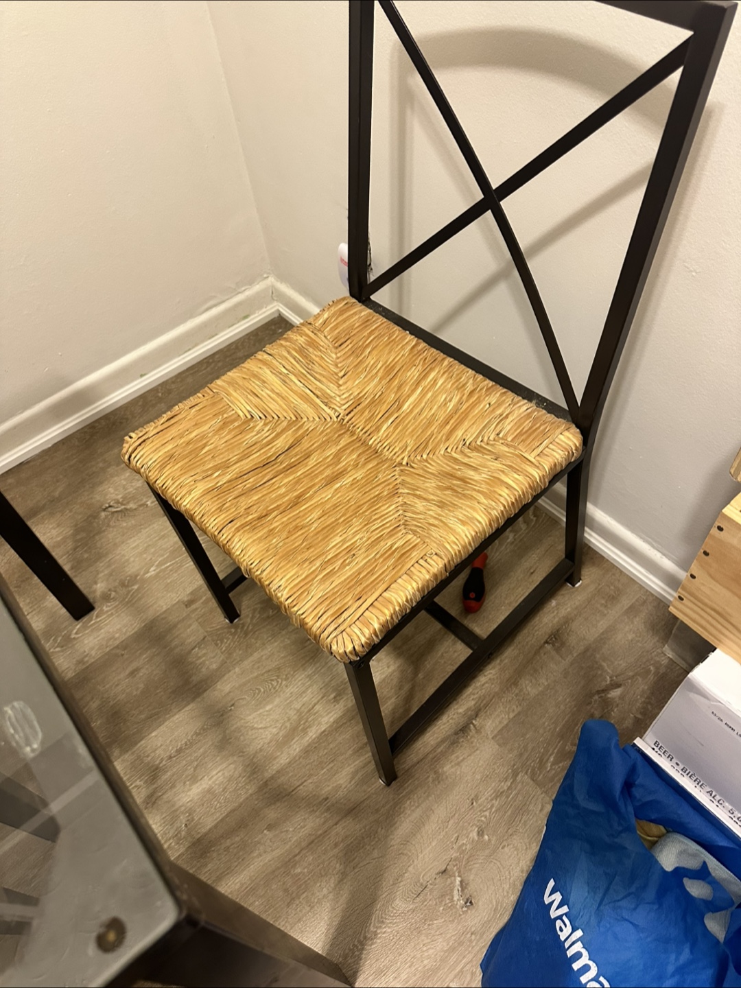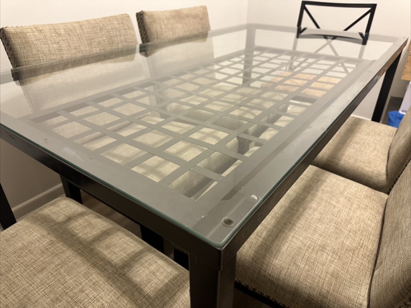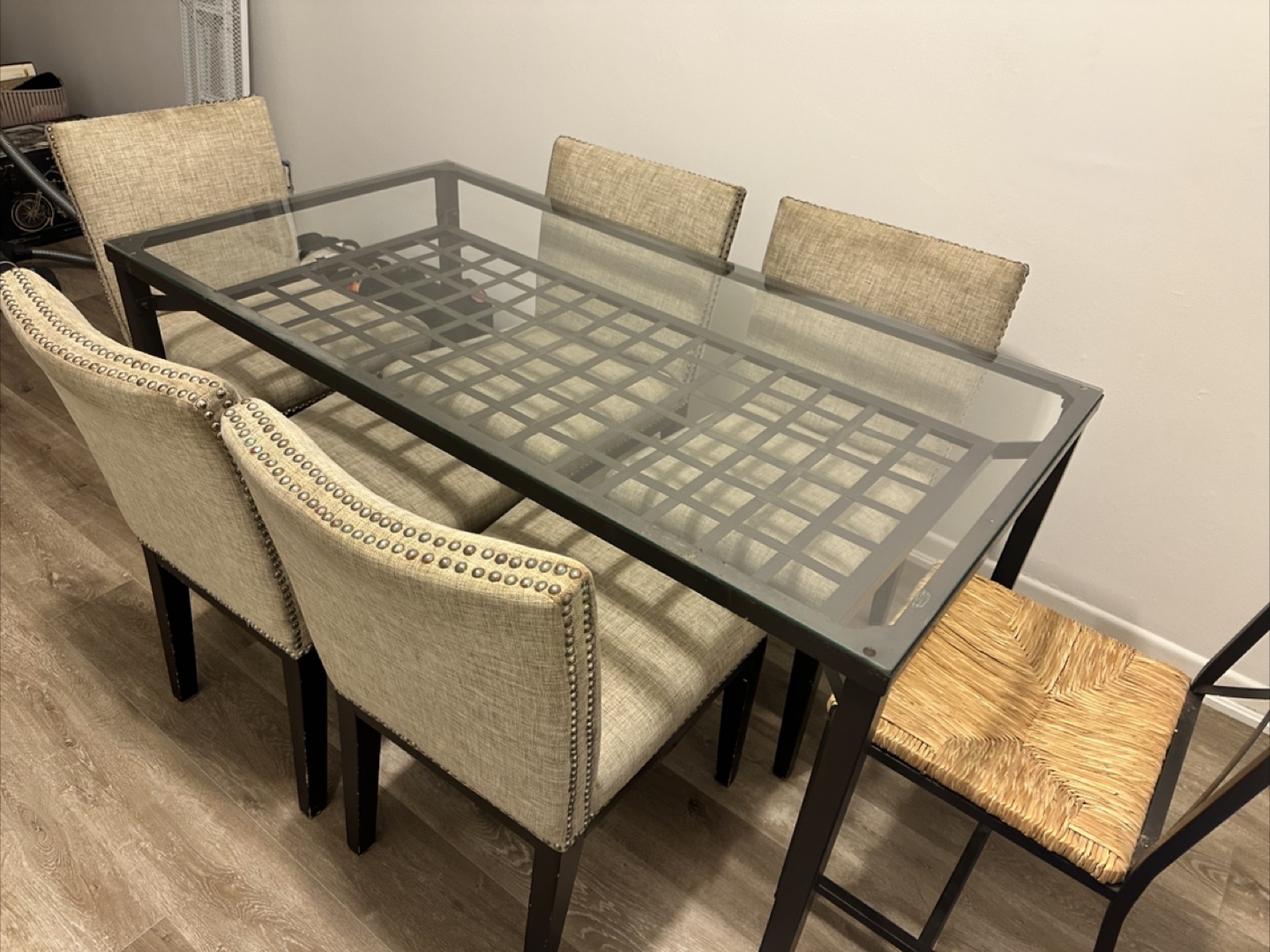 Selling a dining table with a glass top and six chairs. The chairs are upholstered with a neutral-toned fabric and have decorative nailhead trim. The table frame is a dark metal. Only 5 matching chairs. Take as is. The glass top is removable