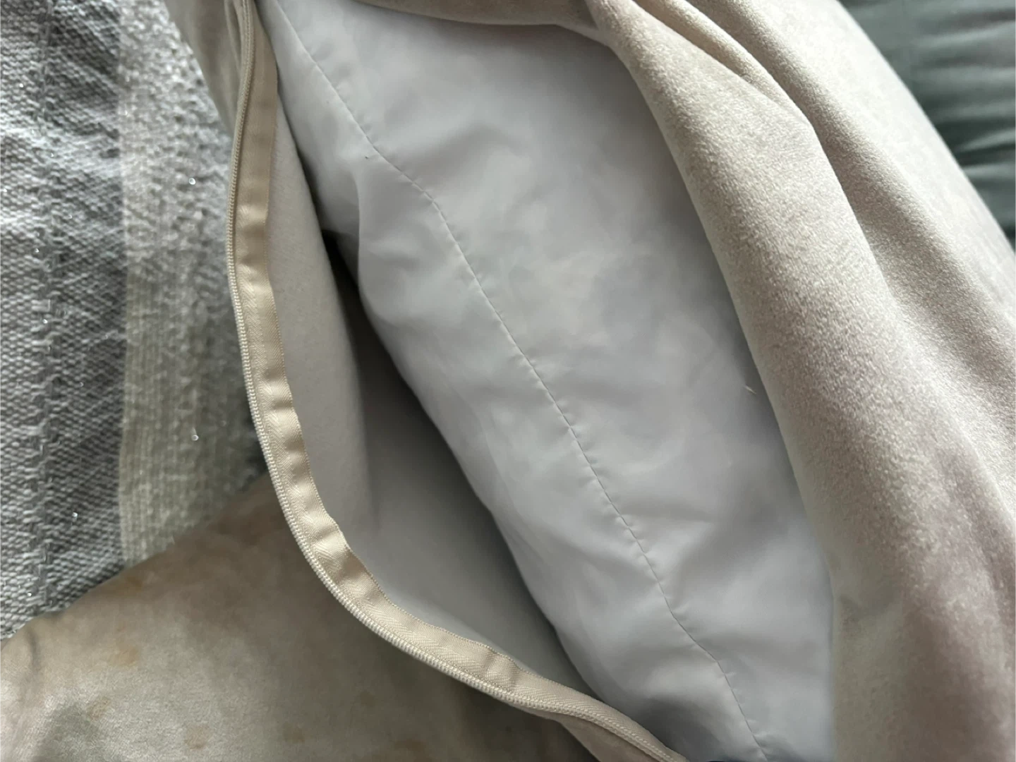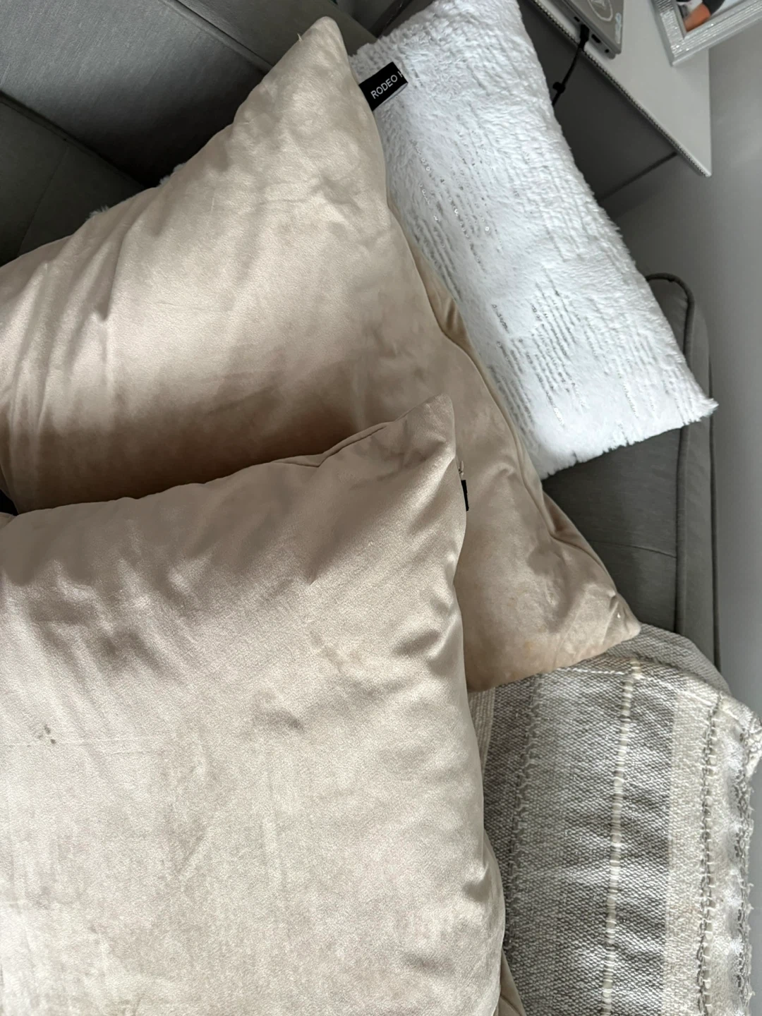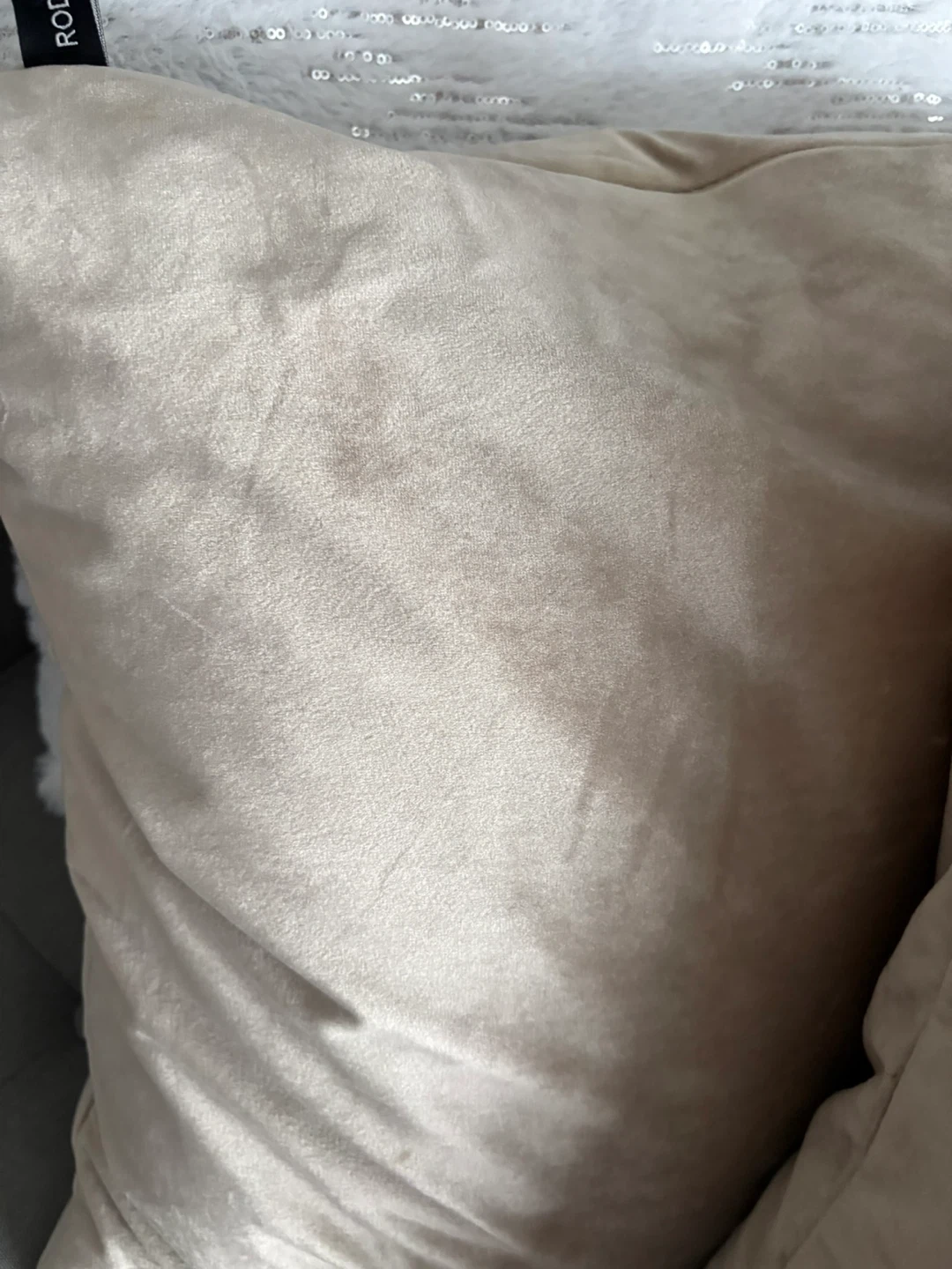 Soft beige velvet throw pillow from Rodeo Home. It's a nice accent piece for any sofa or chair. Pillow cover is made of polyester velvet.