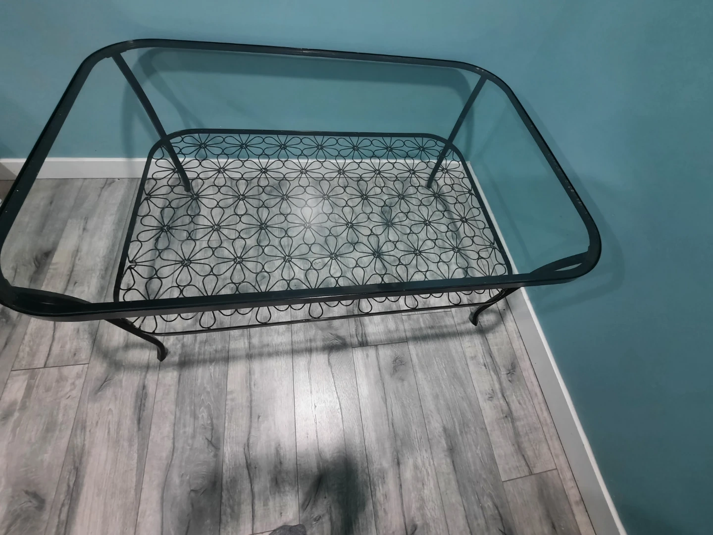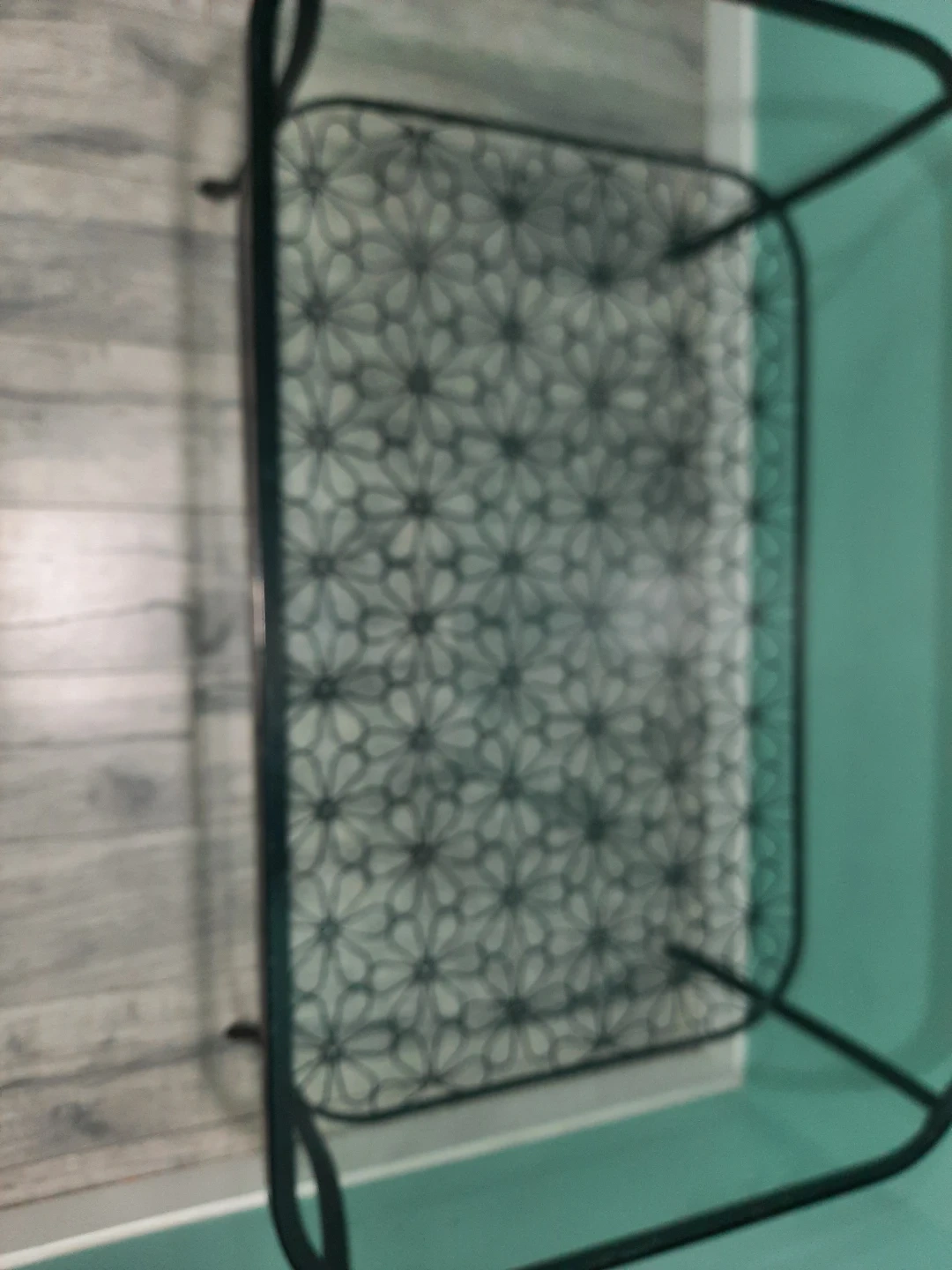 Selling a glass top coffee table with a metal frame. It has a lovely floral pattern on the bottom shelf. It's in great condition and would look great in any living room