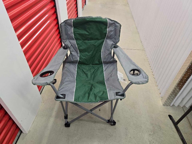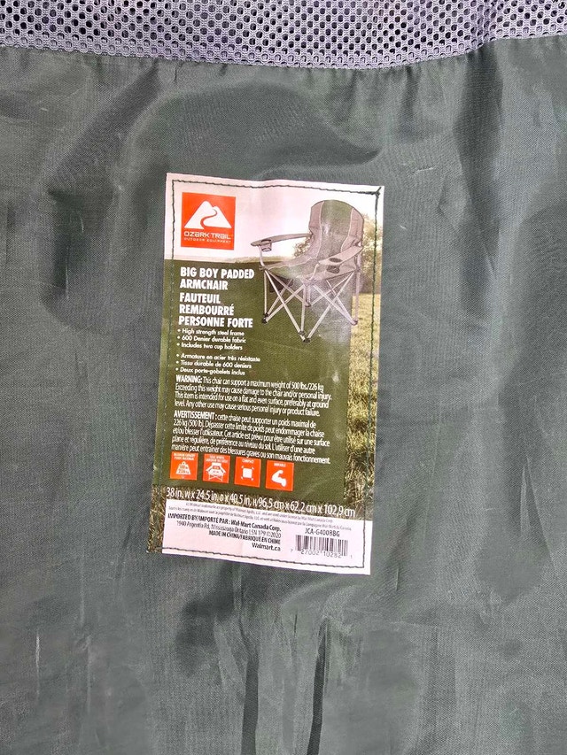 Relax in comfort outdoors with this Ozark Trail big boy padded chair, designed to support individuals with a robust build and offering a comfortable seating experience. This chair has been used and shows signs of wear, but it's still fully functional and ready for your next camping trip or outdoor event. Key features: - Sturdy steel frame for enhanced durability - Padded seat and back for added comfort - Two convenient cup holders to keep your beverages secure - Folds for easy storage and transportation. If the ad is still up, the chair is available. Priced at $20.