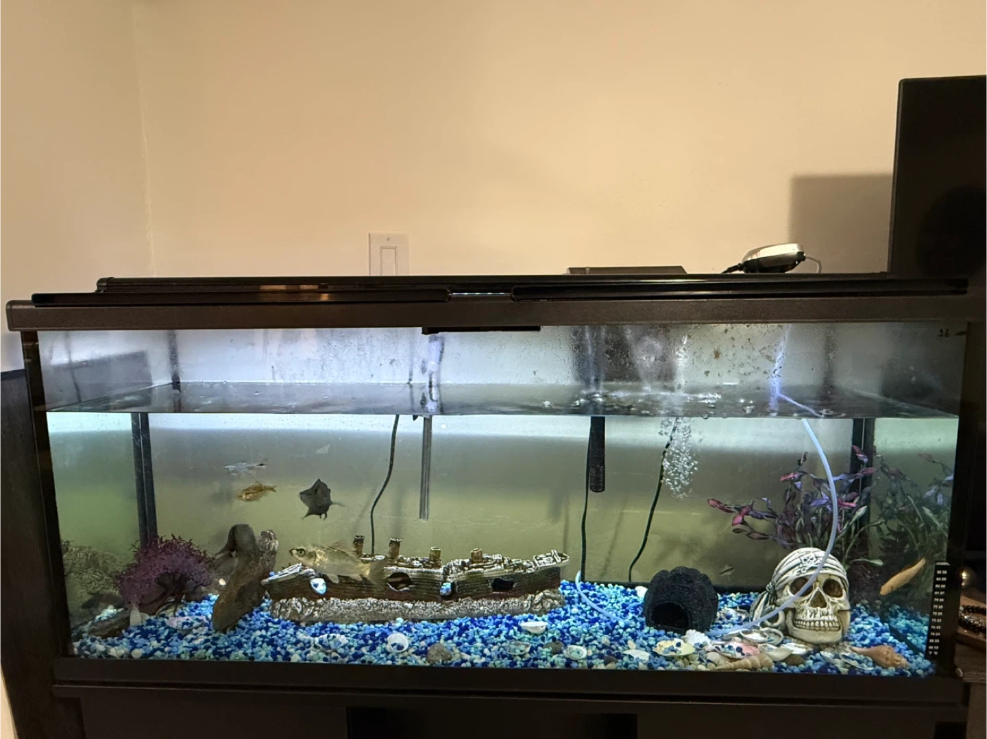 This is a large aquarium tank, perfect for your aquatic pets. It comes with a variety of decorative items, including a sunken ship, a skull,An air pump and filter are also included to keep the water clean and oxygenated. It's ready for your fish!