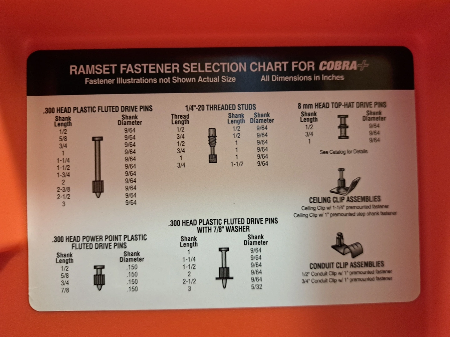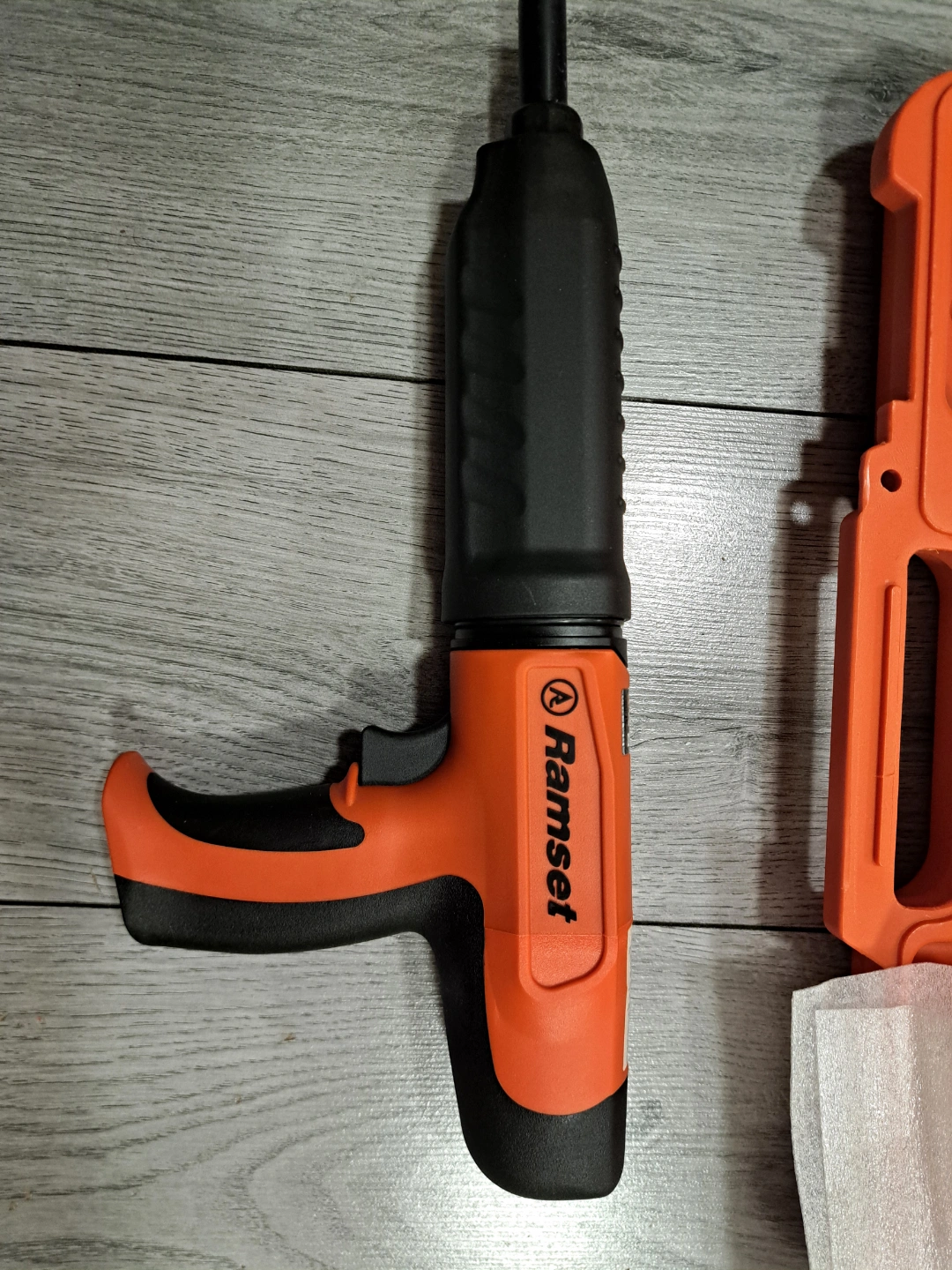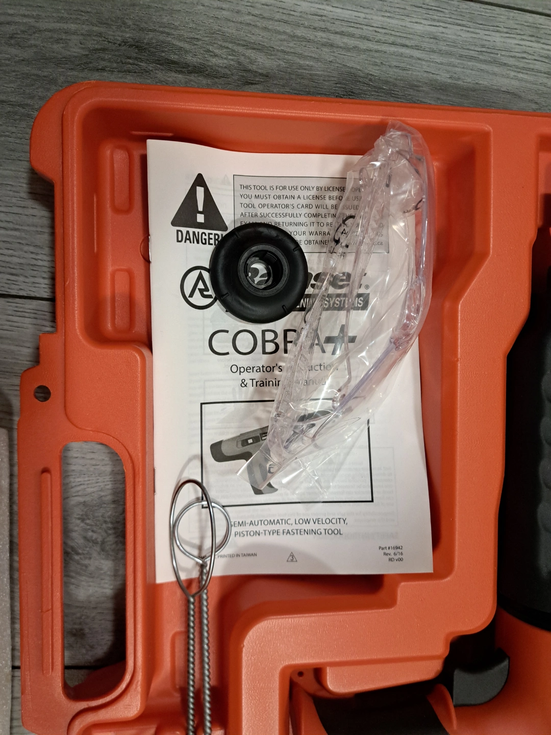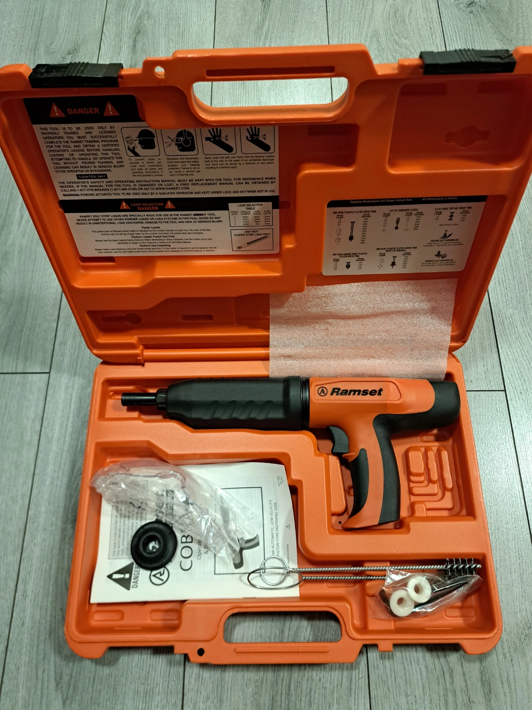 New Ramset Cobra+ fastening tool. Includes case, safety glasses, cleaning brush, and extra parts. Semi-automatic, low velocity, piston-type tool. Part # 20806010.