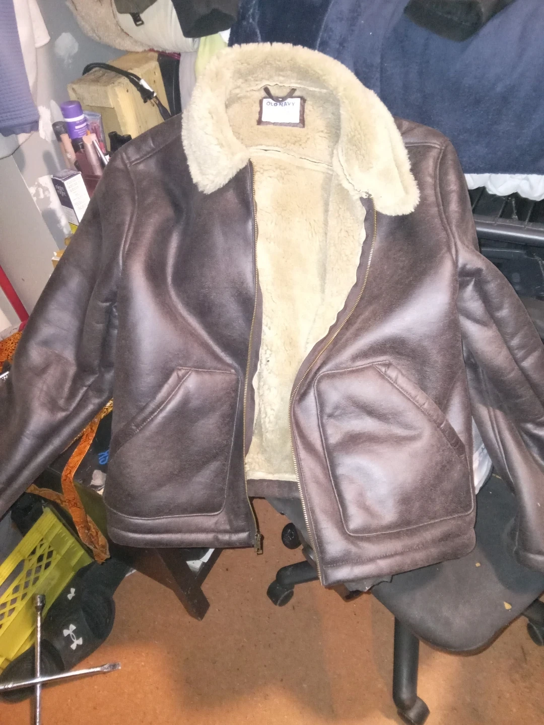 This men's brown faux leather bomber jacket features a cozy shearling lining and collar. It has a full zip closure and two front pockets. Excellent for keeping warm on cooler days!
