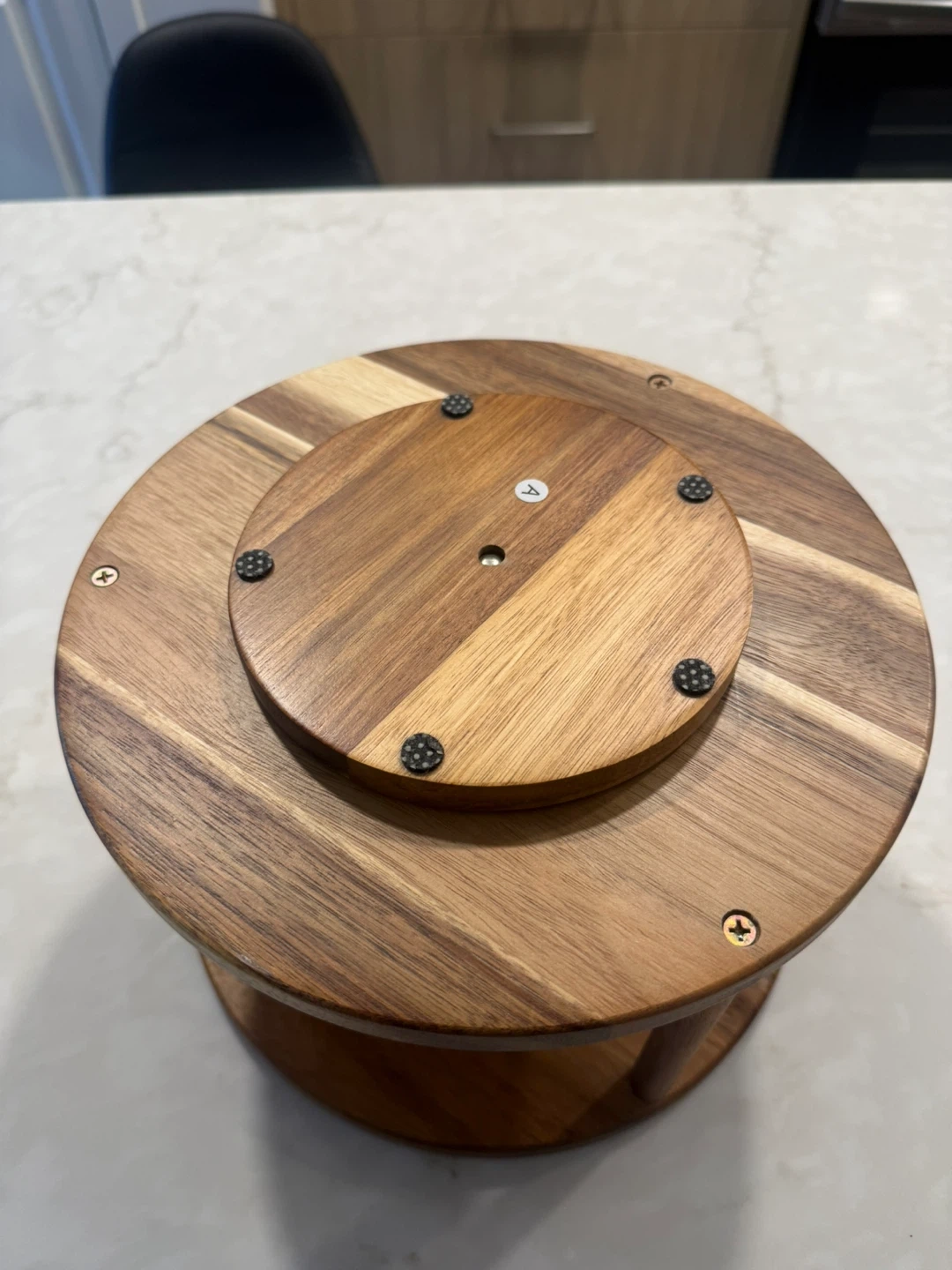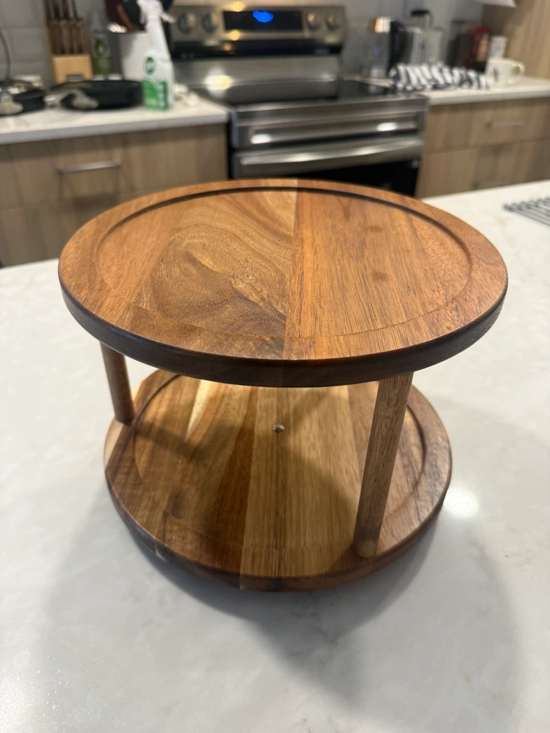 Two-tiered wooden serving stand made from warm-toned wood. It's perfect for displaying desserts or appetizers at parties. The stand has a nice, natural wood finish.