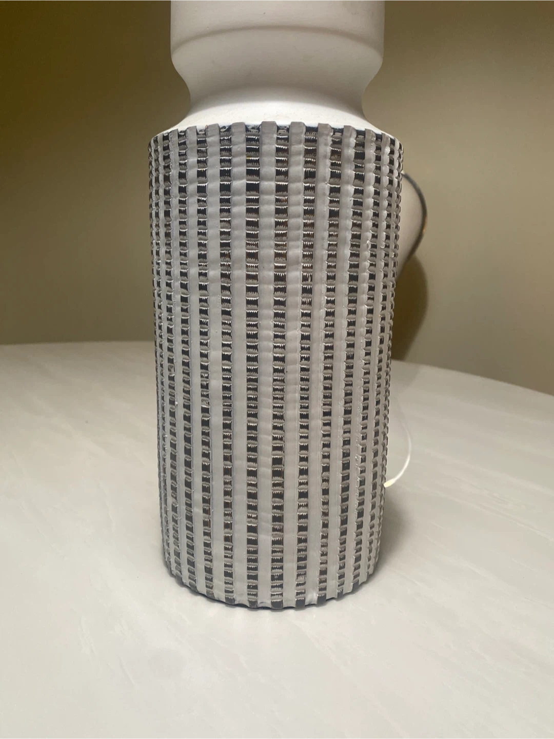 This is a stylish white vase featuring a unique textured band around the lower portion. Its clean lines and neutral colours make it a versatile decor piece. It's a great addition to any tabletop or shelf!