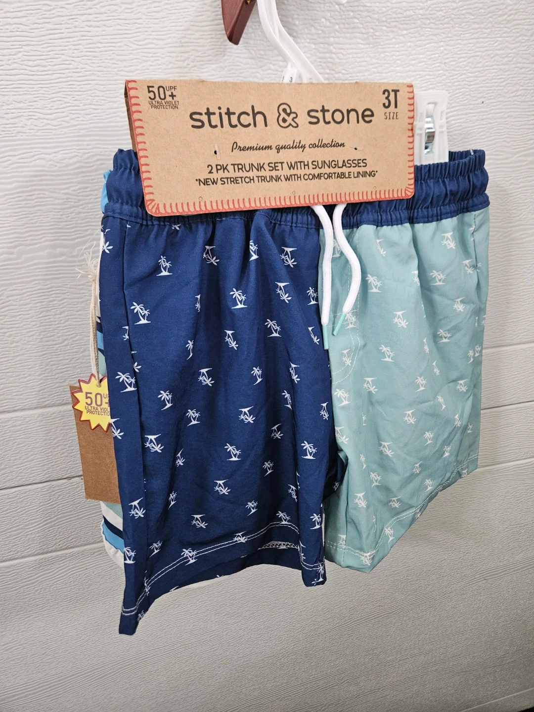 This is a 2 pack of boys' swim trunks from Stitch & Stone in size 3T. Both trunks feature a stretch fabric with comfortable lining. Includes a pair of sunglasses.