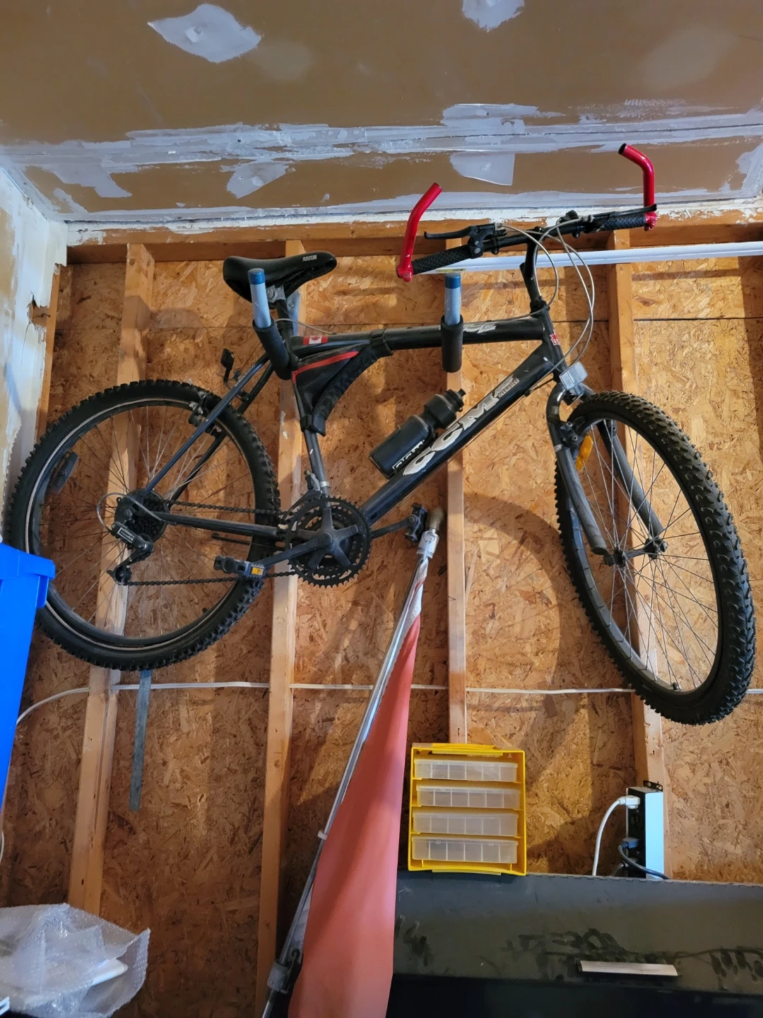 This is a GT Aggressor mountain bike. It's black with red handlebar grips. It comes with a water bottle cage attached to the frame. Ready for your next adventure!