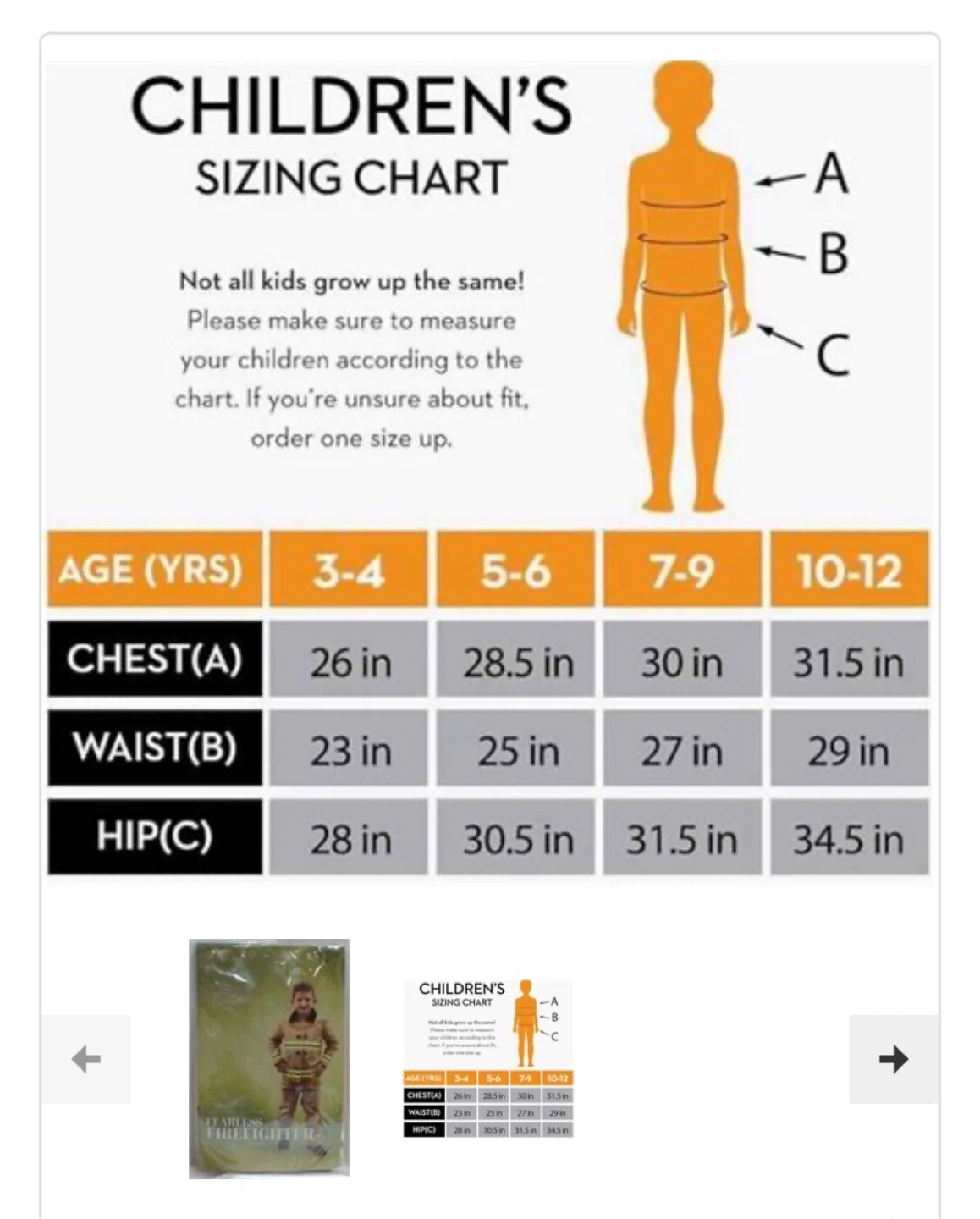 This firefighter costume is designed for kids. It includes a jacket and pants. Sizing is available for age 7-9,