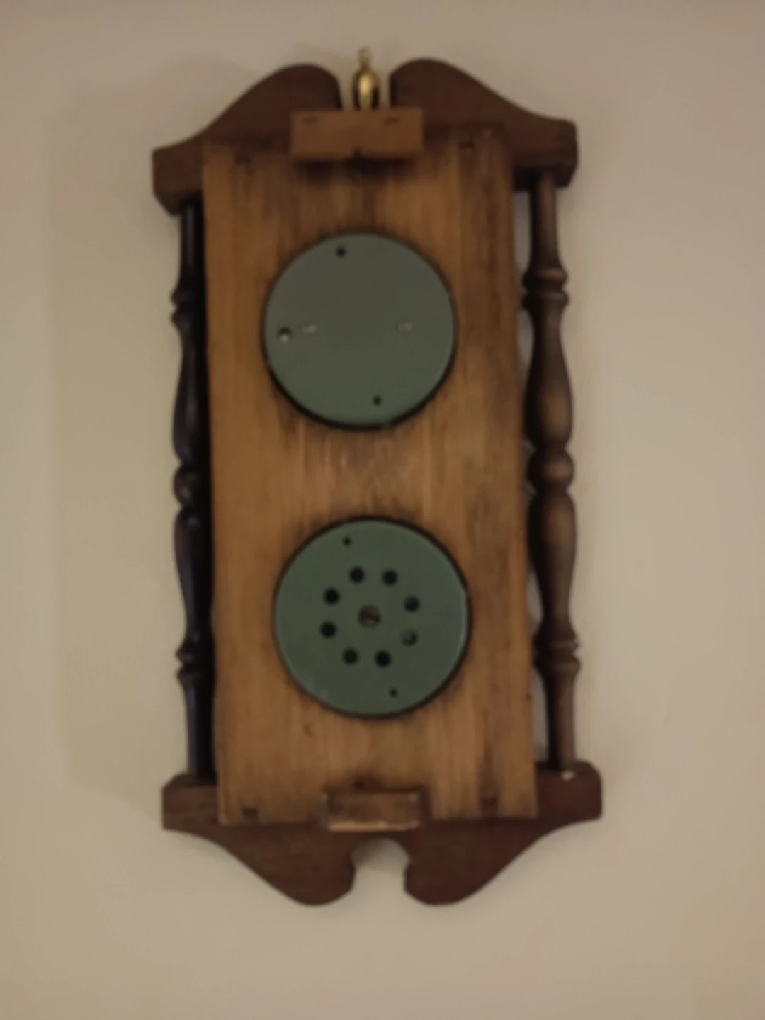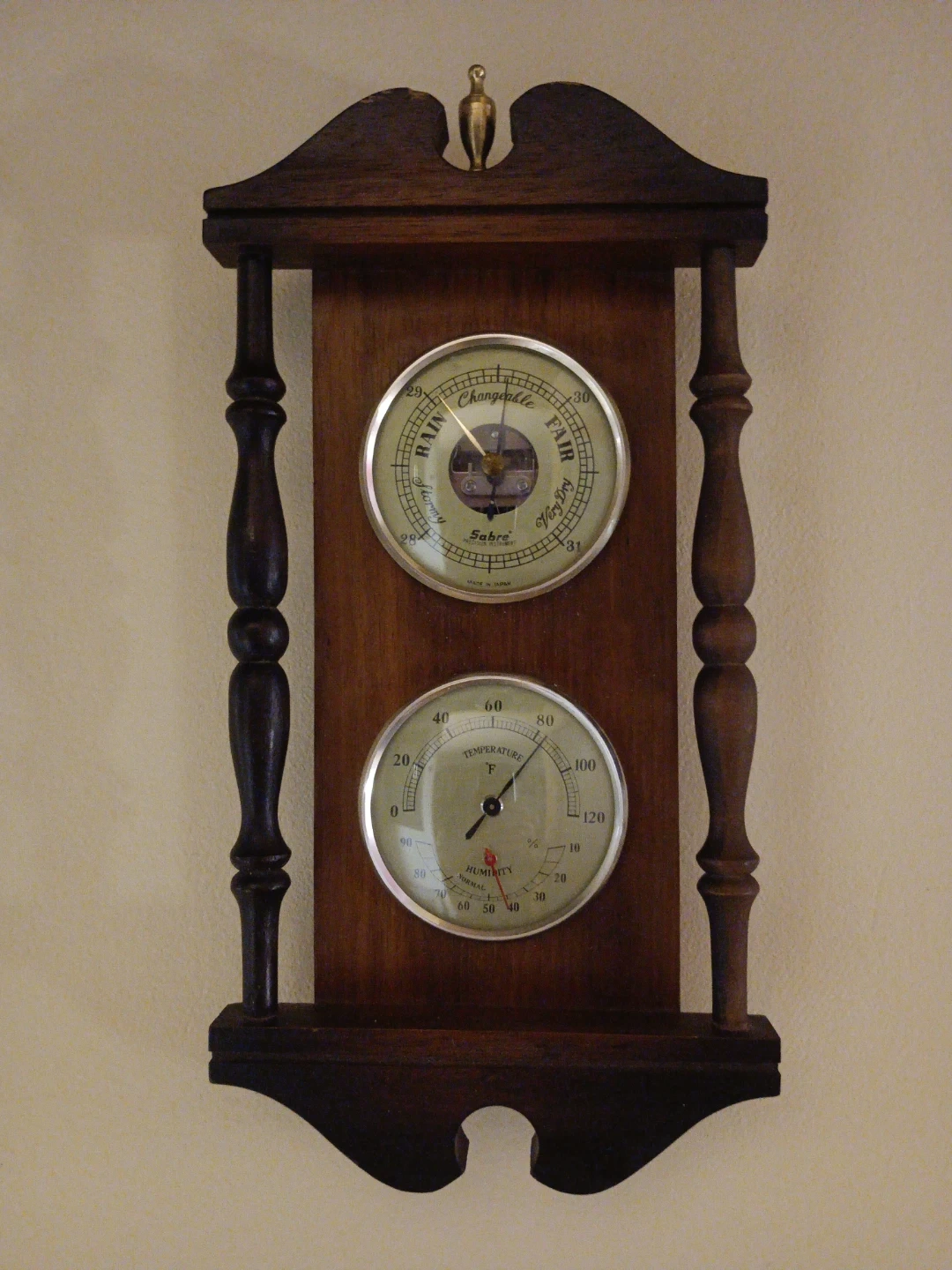 This wooden wall unit features a barometer and a thermometer. The barometer indicates 'Fair' and 'Changeable' weather conditions. Temperature readings are in Fahrenheit, with a humidity indicator also present. It's a classic piece for monitoring indoor climate!