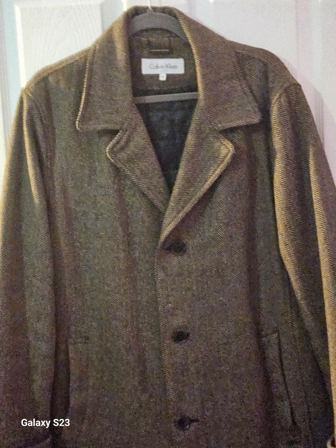 This Calvin Klein overcoat features a classic herringbone pattern. It's made from a wool blend for warmth. The coat has a notched lapel and a button-front closure. It's a versatile piece for cooler weather!