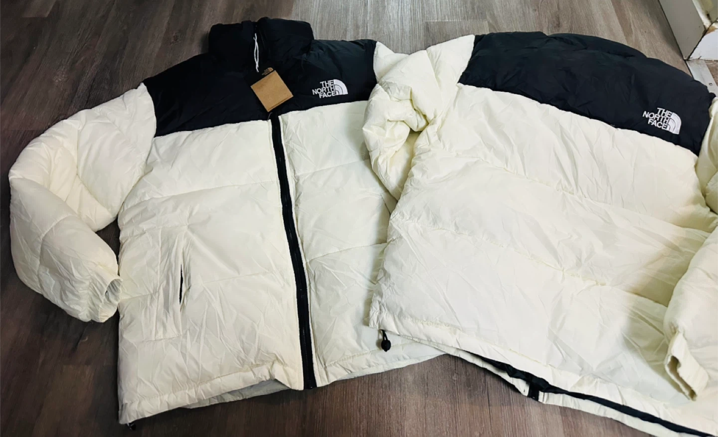 This is a cream and black puffer jacket from The North Face. It's insulated for warmth. It has a full zip closure and zippered pockets.