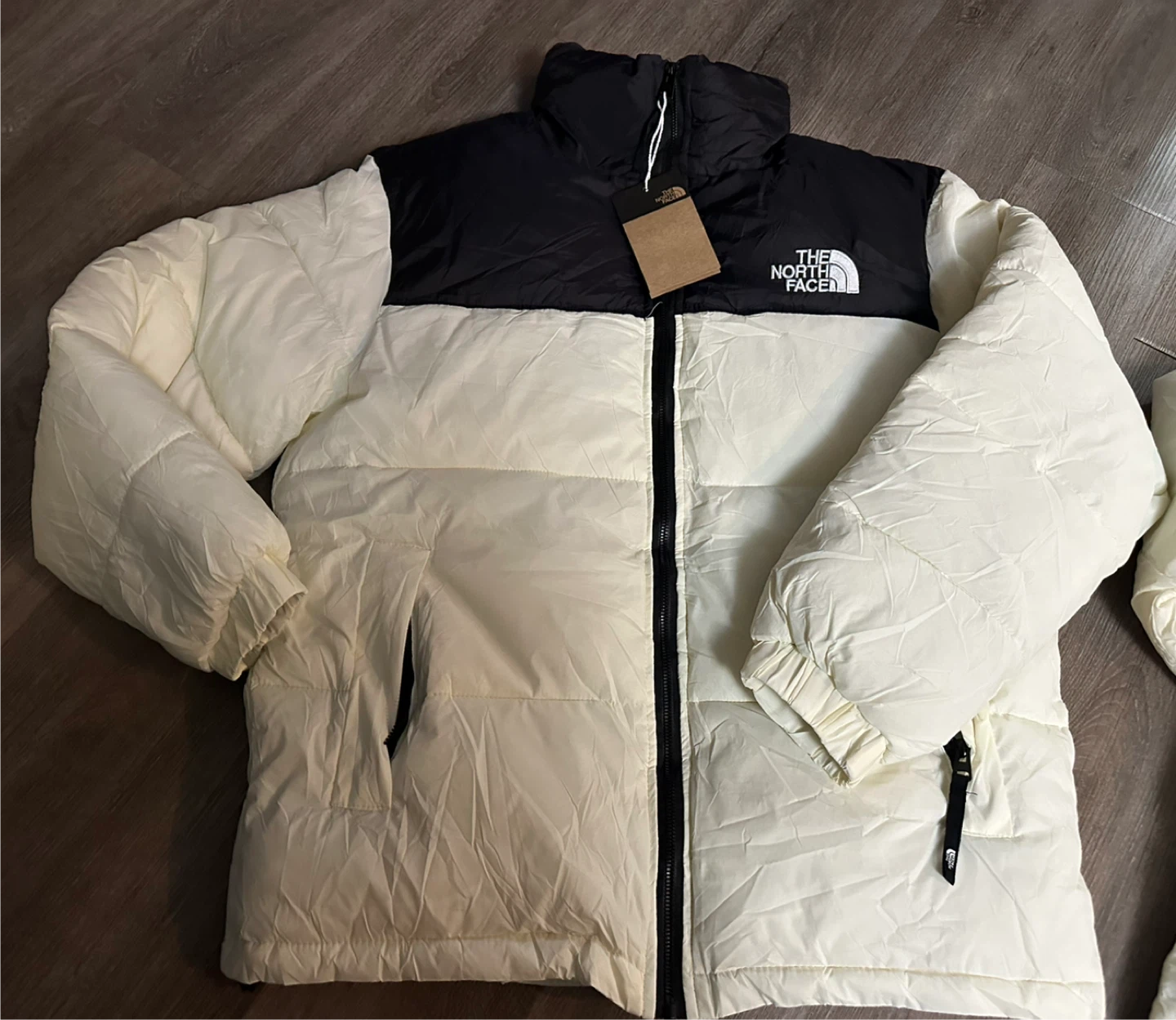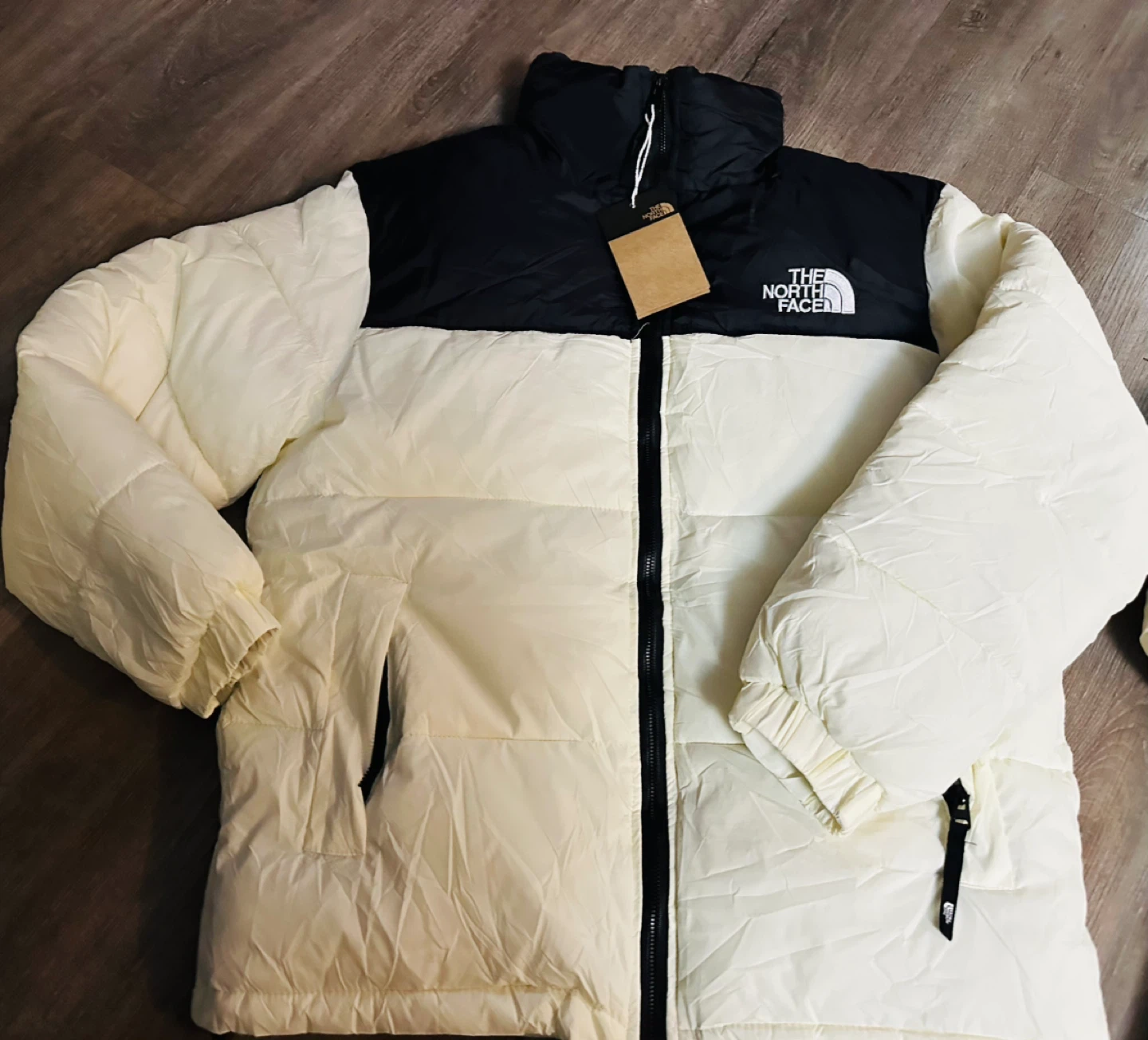 This is a cream and black puffer jacket from The North Face. It's insulated for warmth. It has a full zip closure and zippered pockets.