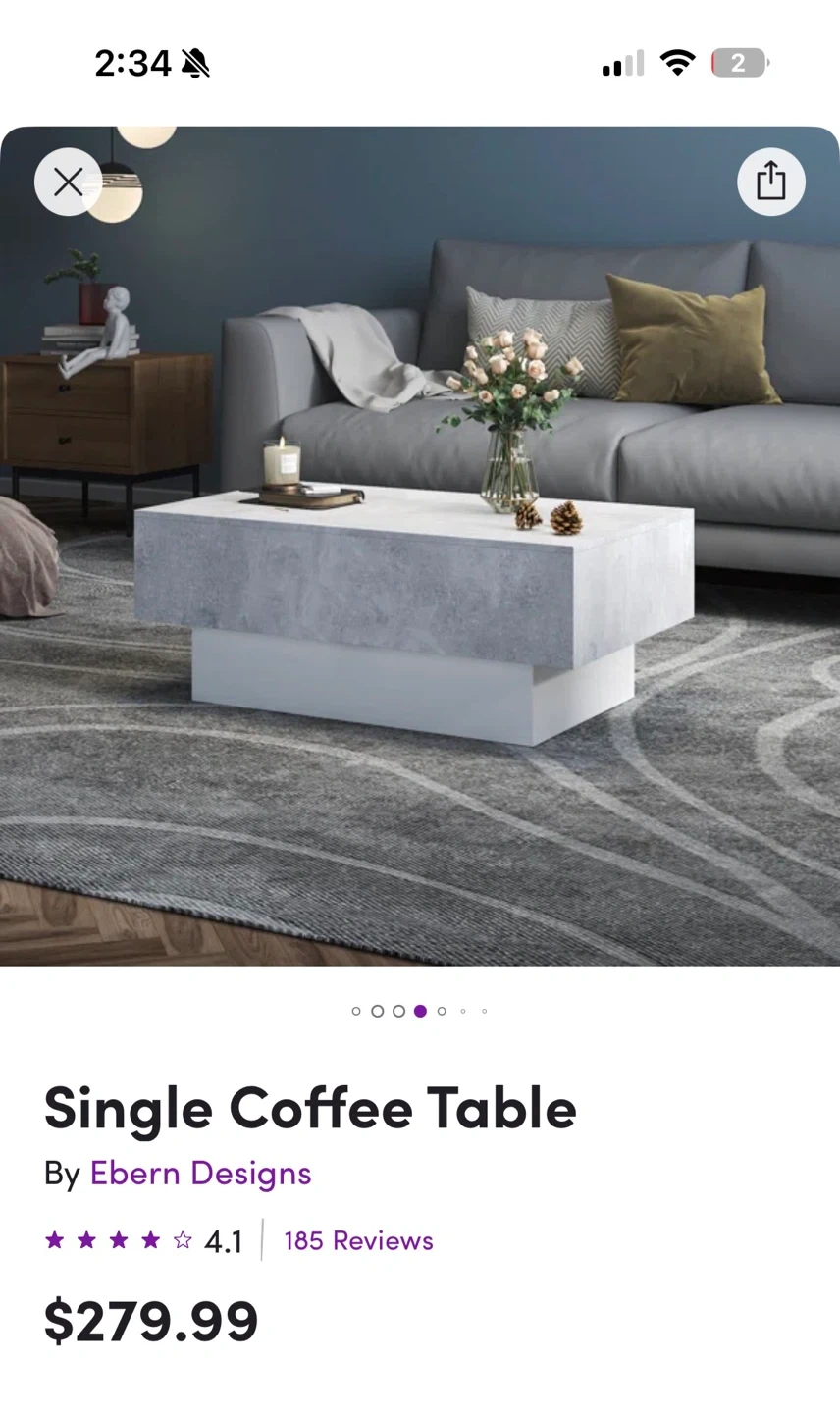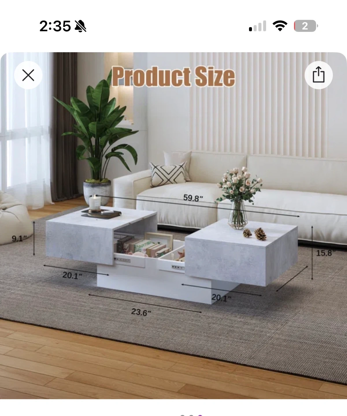 Stylish coffee table featuring a modern grey concrete-look finish with a white base. It boasts a clever double push-pull design for easy access and hidden storage. Dimensions: 59.8" W x 20.1" D x 15.8" H.