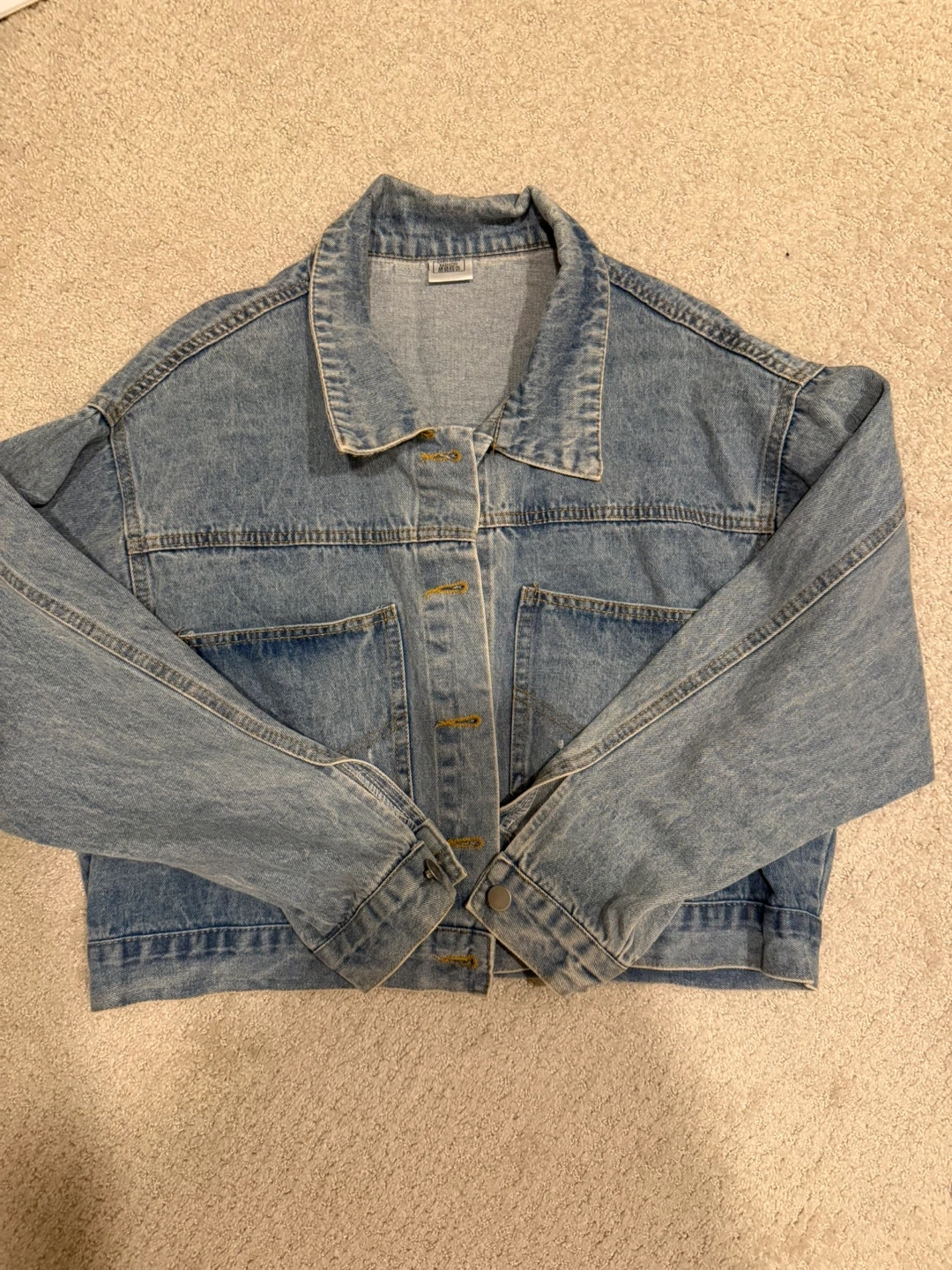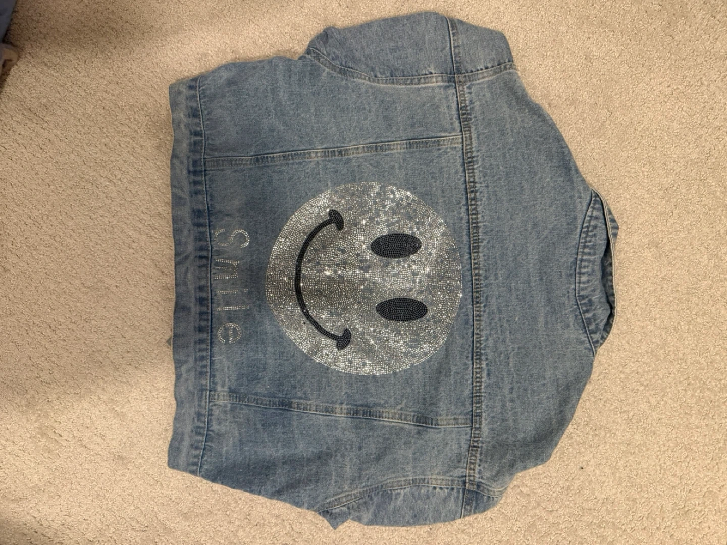This is a blue denim jacket with a large rhinestone smiley face on the back. It features a classic collar, button-up front, and two chest pockets. It's a fun and stylish addition to any casual outfit!