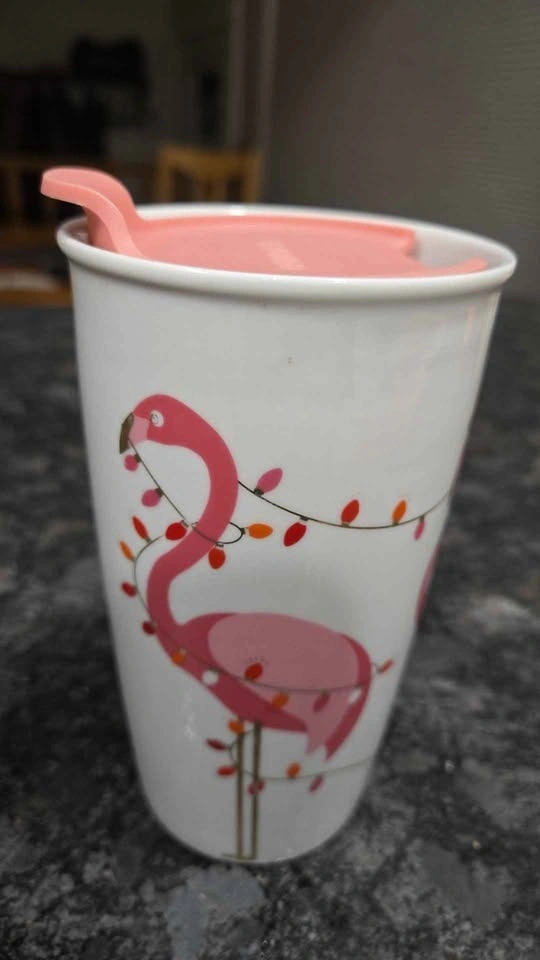 Cute Christmas ceramic travel mug with flamingos, Santa hats, and holiday lights. Pink lid. Perfect for that special someone... maybe YOU? Pickup in Lakeview in S.W.