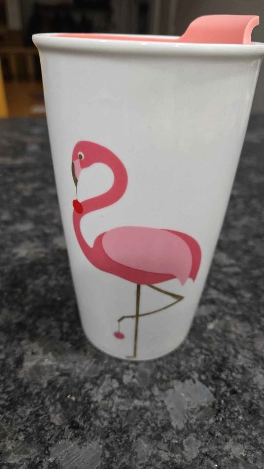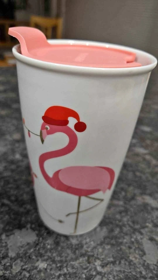 Cute Christmas ceramic travel mug with flamingos, Santa hats, and holiday lights. Pink lid. Perfect for that special someone... maybe YOU? Pickup in Lakeview in S.W.
