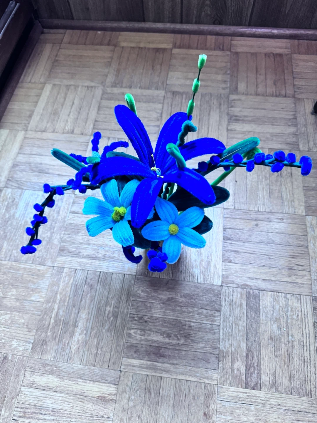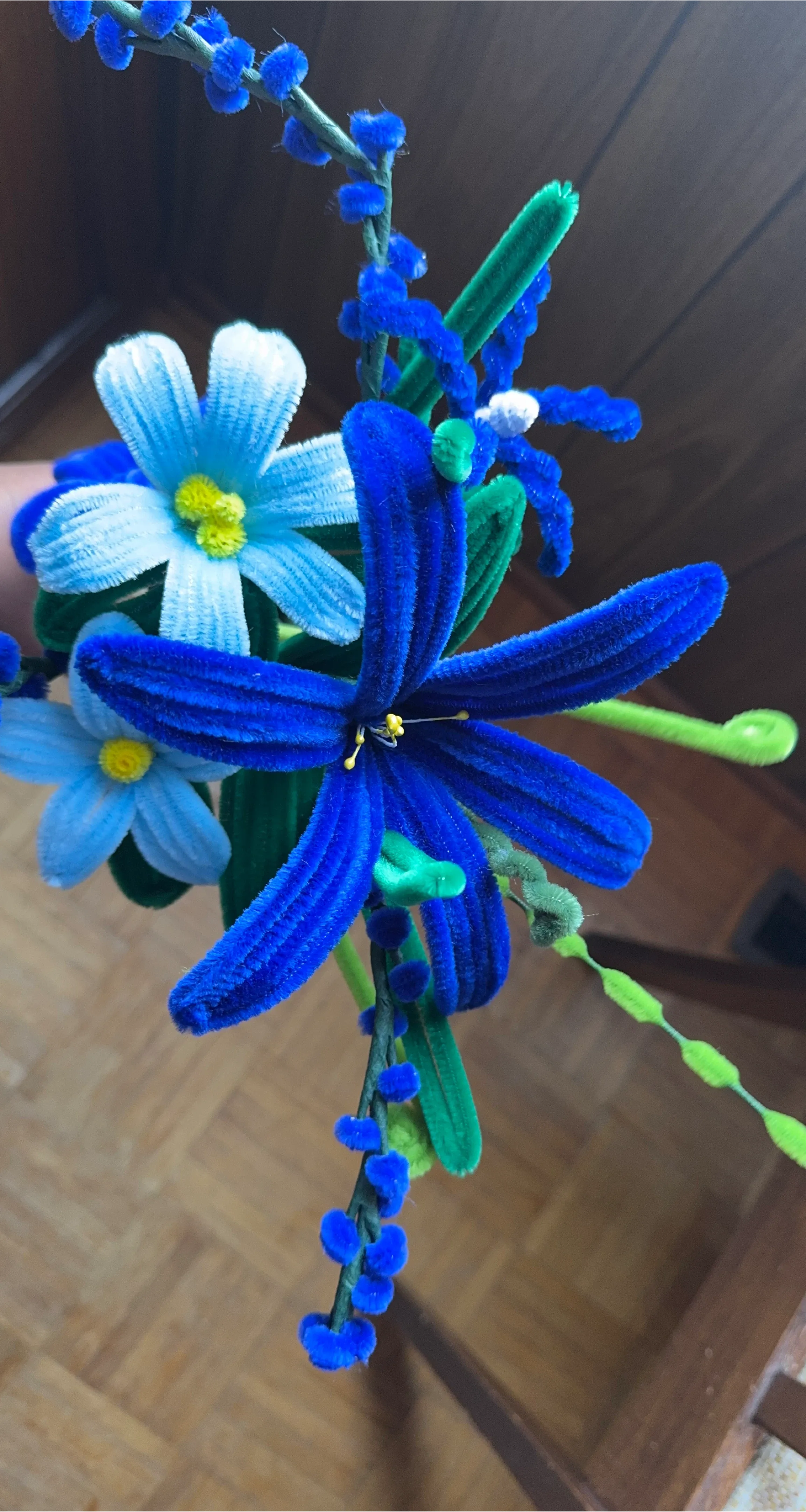 A handmade flowers crafted from blue and green pipe cleaners. Each flower features bright blue petals and yellow centres, with green stems and leaves. These decorative blooms add a pop of colour to any space.