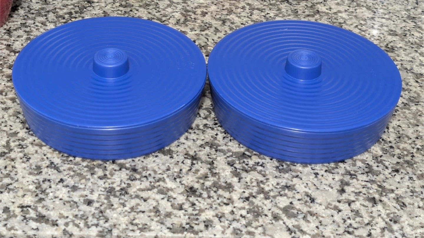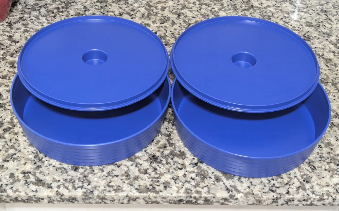 Two round containers. Comes with lids. Each container has a flat, ridged body. Round lids. The lids have a circular recess and a small centre handle. These containers can be a lovely way to store your snacks or leftovers after a long day. Take both $10