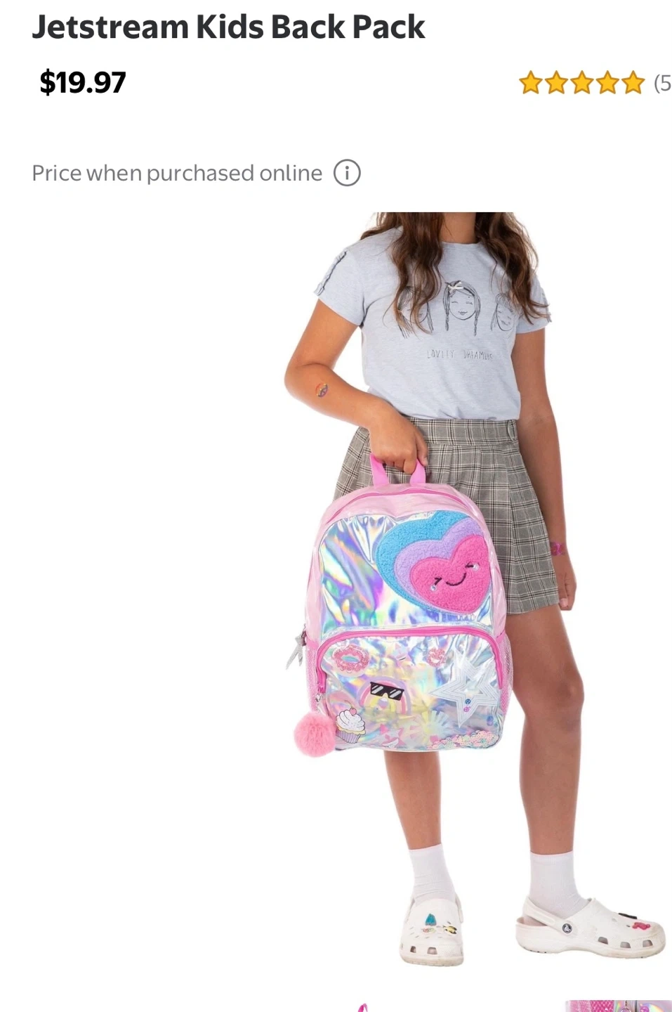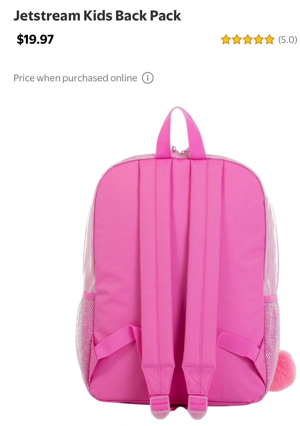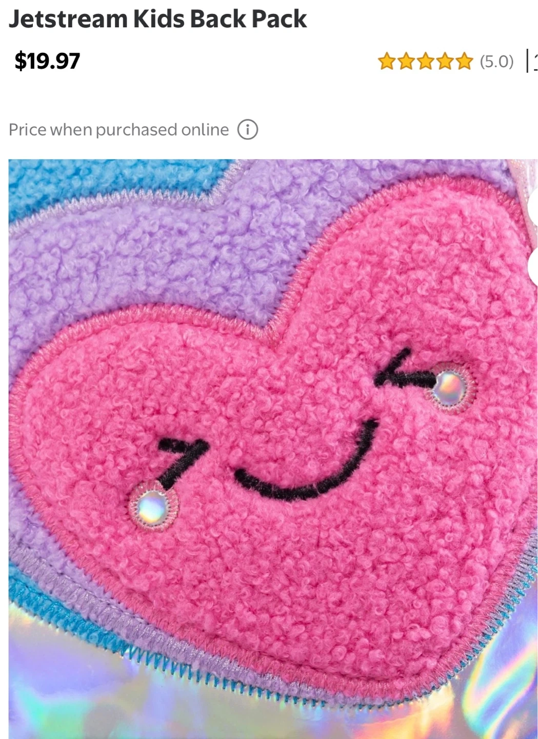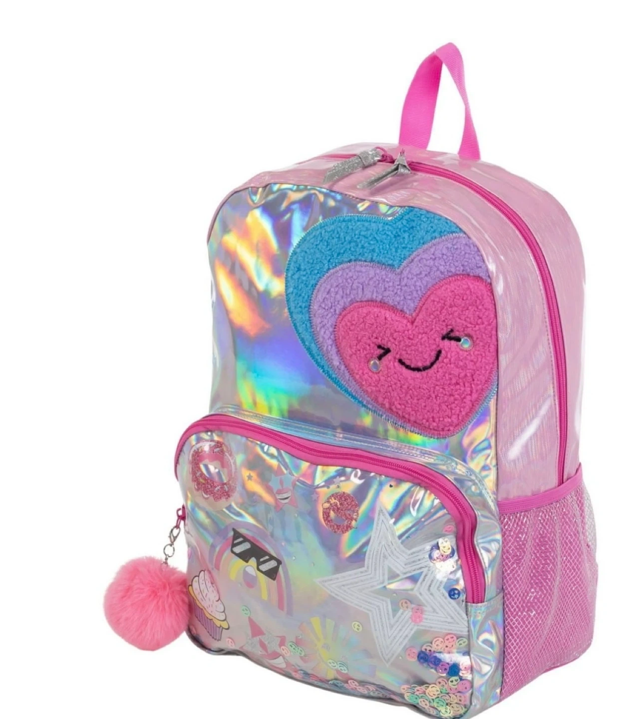 This adorable Jetstream kids backpack features a fluffy heart design with glitter accents. It has a main zippered compartment and a smaller front pocket, plus side mesh pockets. The adjustable straps ensure a comfortable fit for little ones.