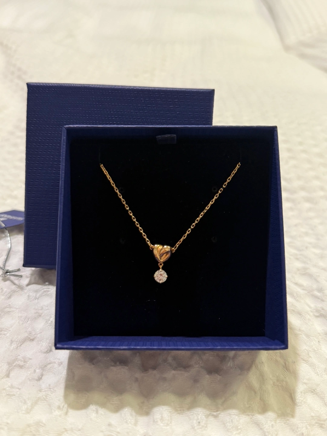 Selling a beautiful Swarovski necklace in excellent condition! Never worn. It features a delicate gold-tone chain with a heart-shaped pendant and a sparkling crystal accent. Comes with the original box and tag, perfect for gifting or treating yourself!