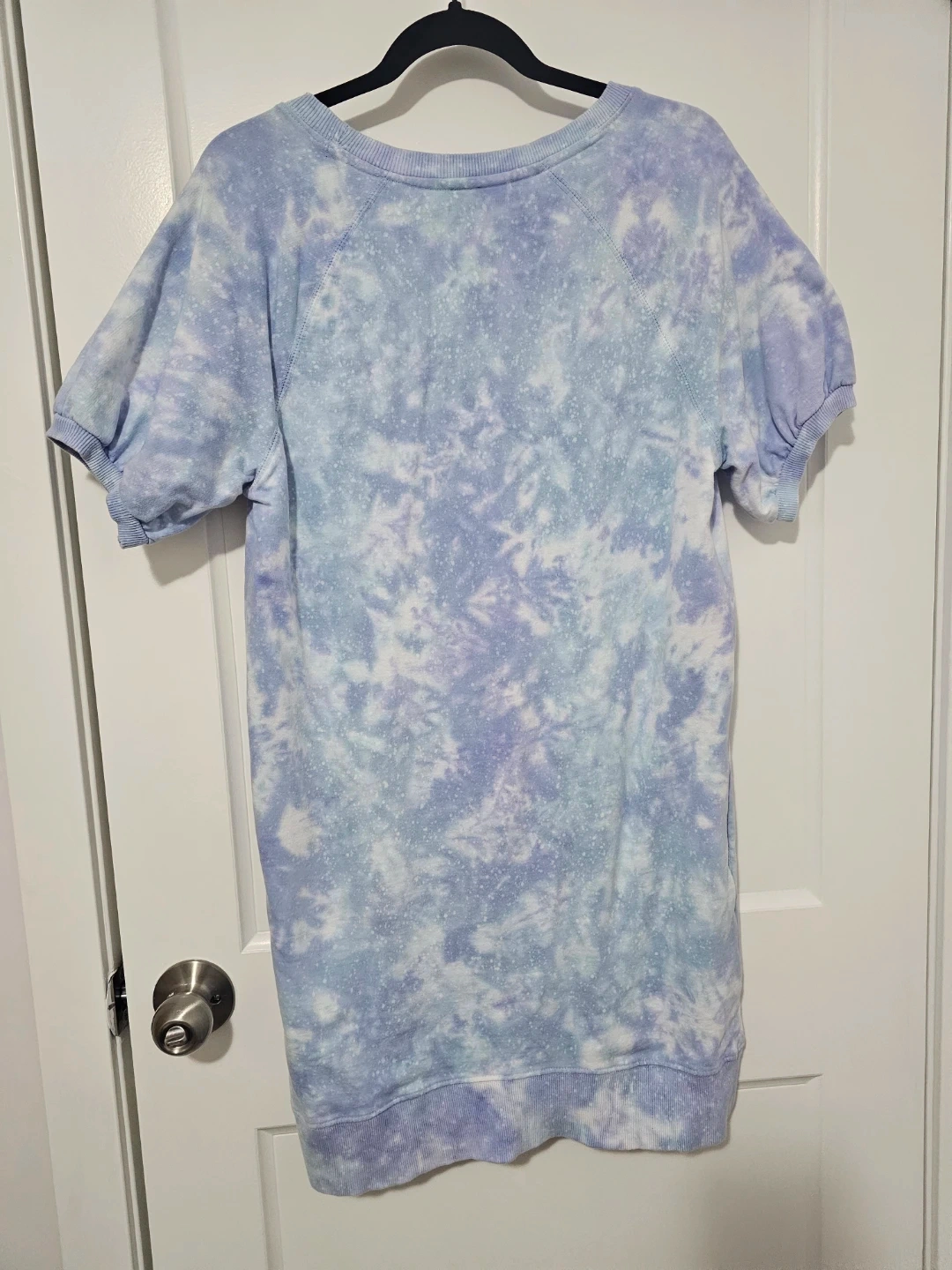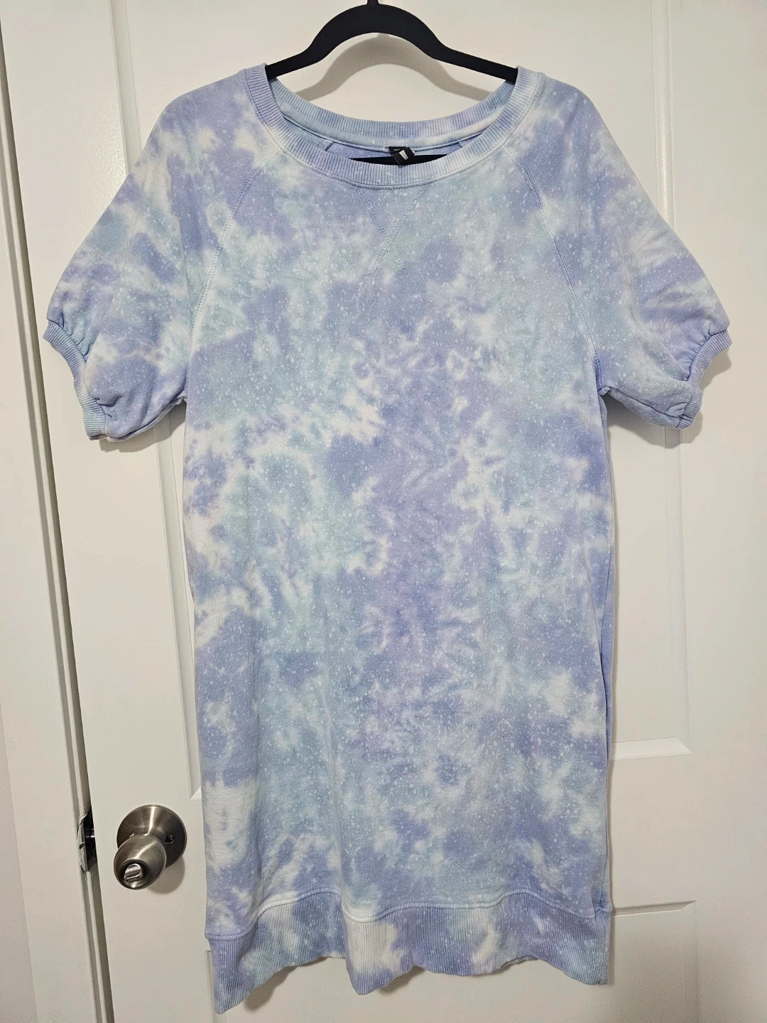 A cozy DESIGN LAB tie-dye sweatshirt dress. Features short puff sleeves and a ribbed hem. Made of a soft cotton blend fabric.