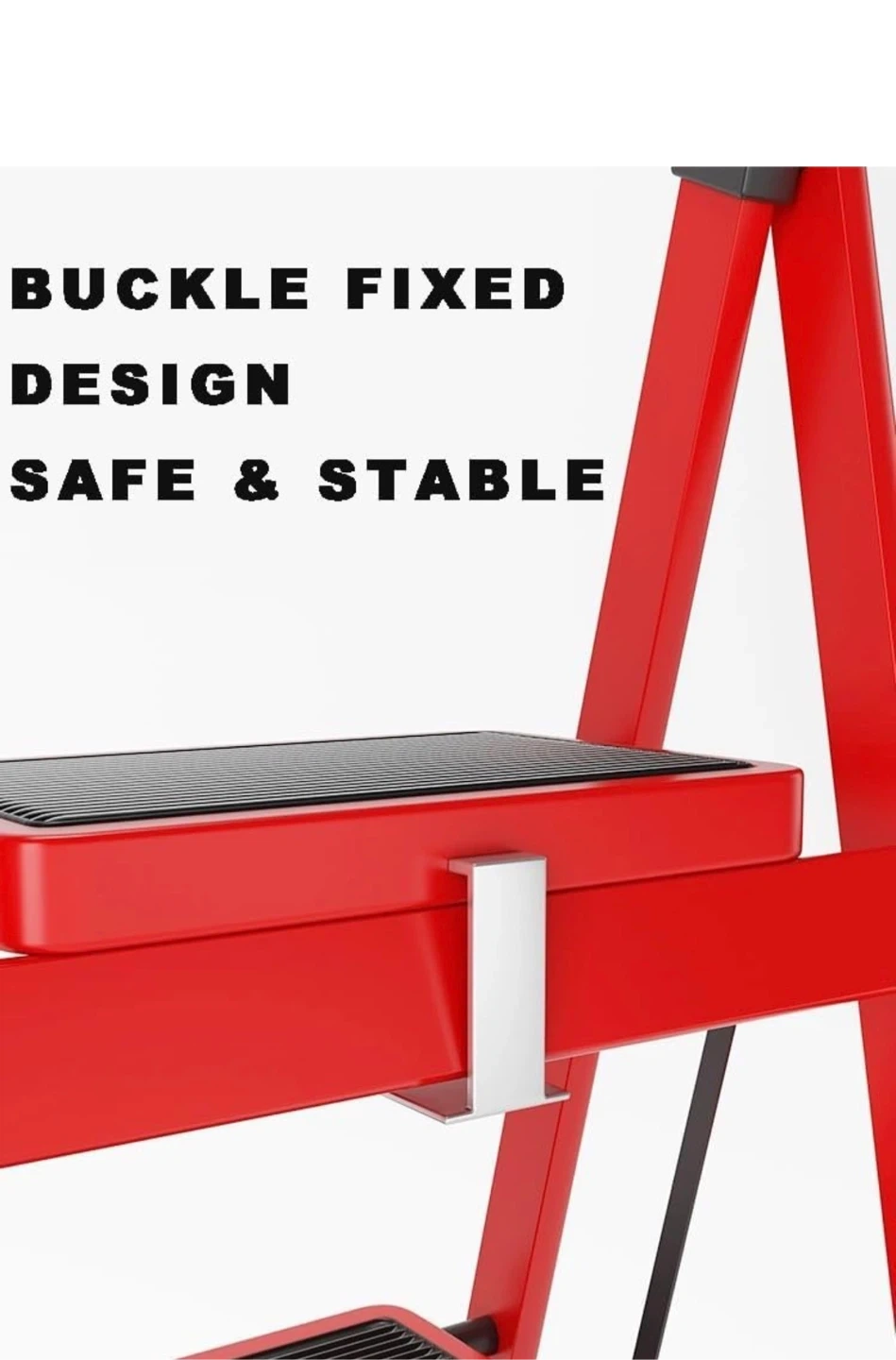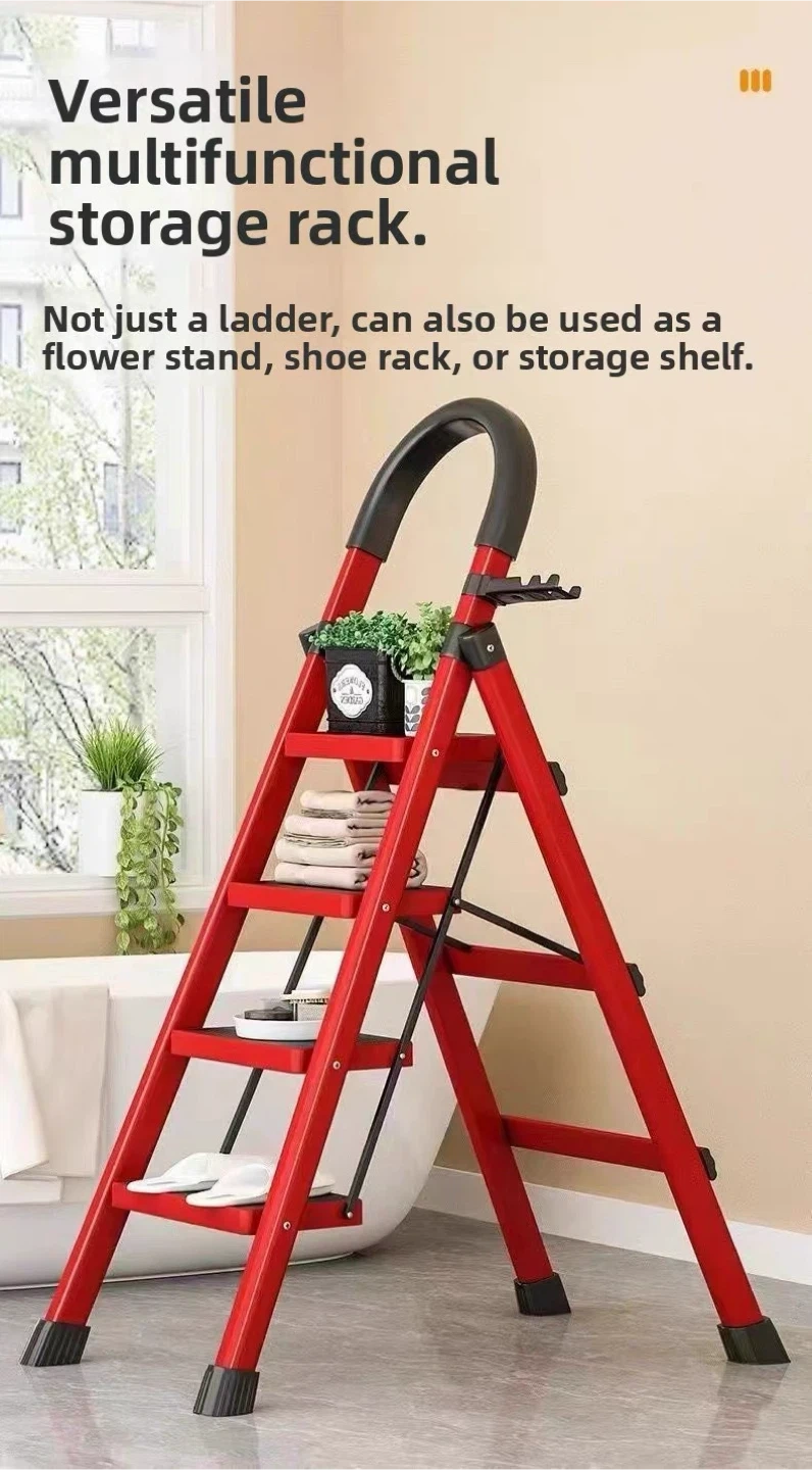 This red folding ladder has 5 steps with 30cm/11.8" widened and anti-slip pedals for safety. It's safe and stable with a buckle-fixed design and includes a tool handle. Dimensions: 170cm/66.9in height when folded, 85cm/33.5in base width, 159cm/62.6in height when open.