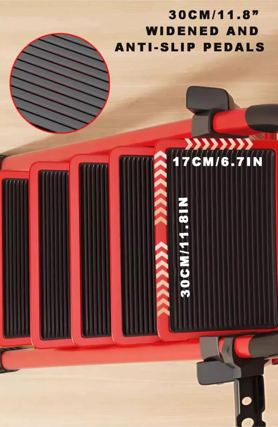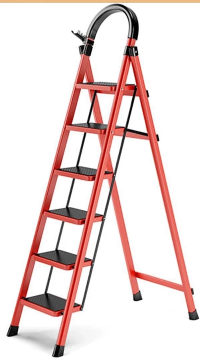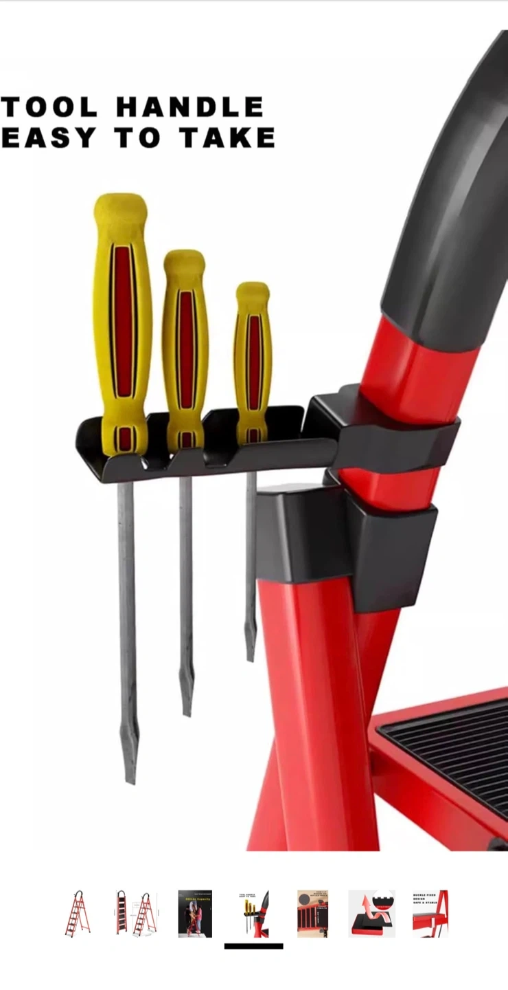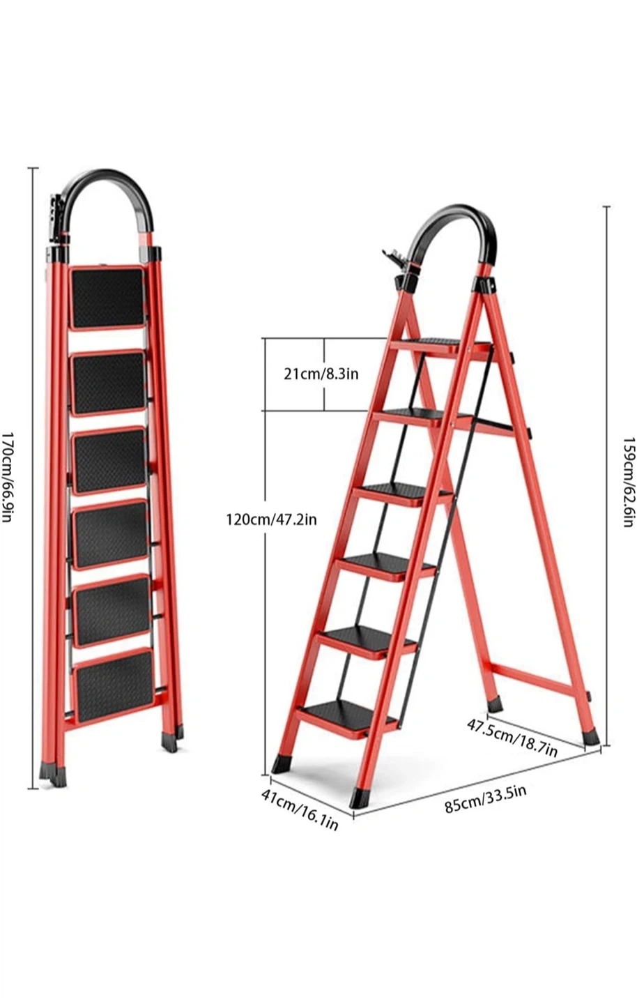 This red folding ladder has 5 steps with 30cm/11.8" widened and anti-slip pedals for safety. It's safe and stable with a buckle-fixed design and includes a tool handle. Dimensions: 170cm/66.9in height when folded, 85cm/33.5in base width, 159cm/62.6in height when open.