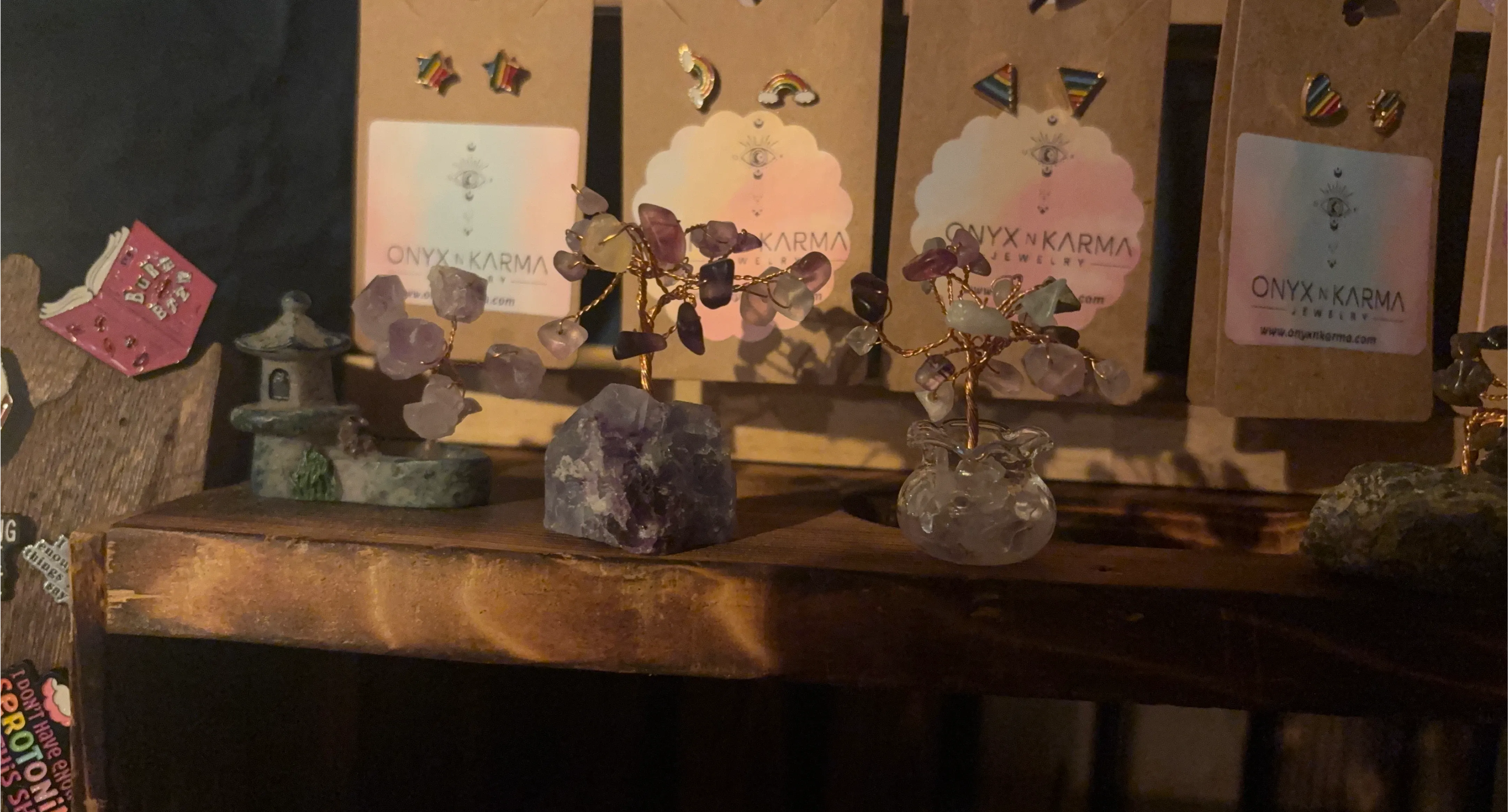 Check out these cute items from Onyx n Karma Jewelry! There's a crystal tree and various earrings on display. Perfect for adding a little sparkle to your day!