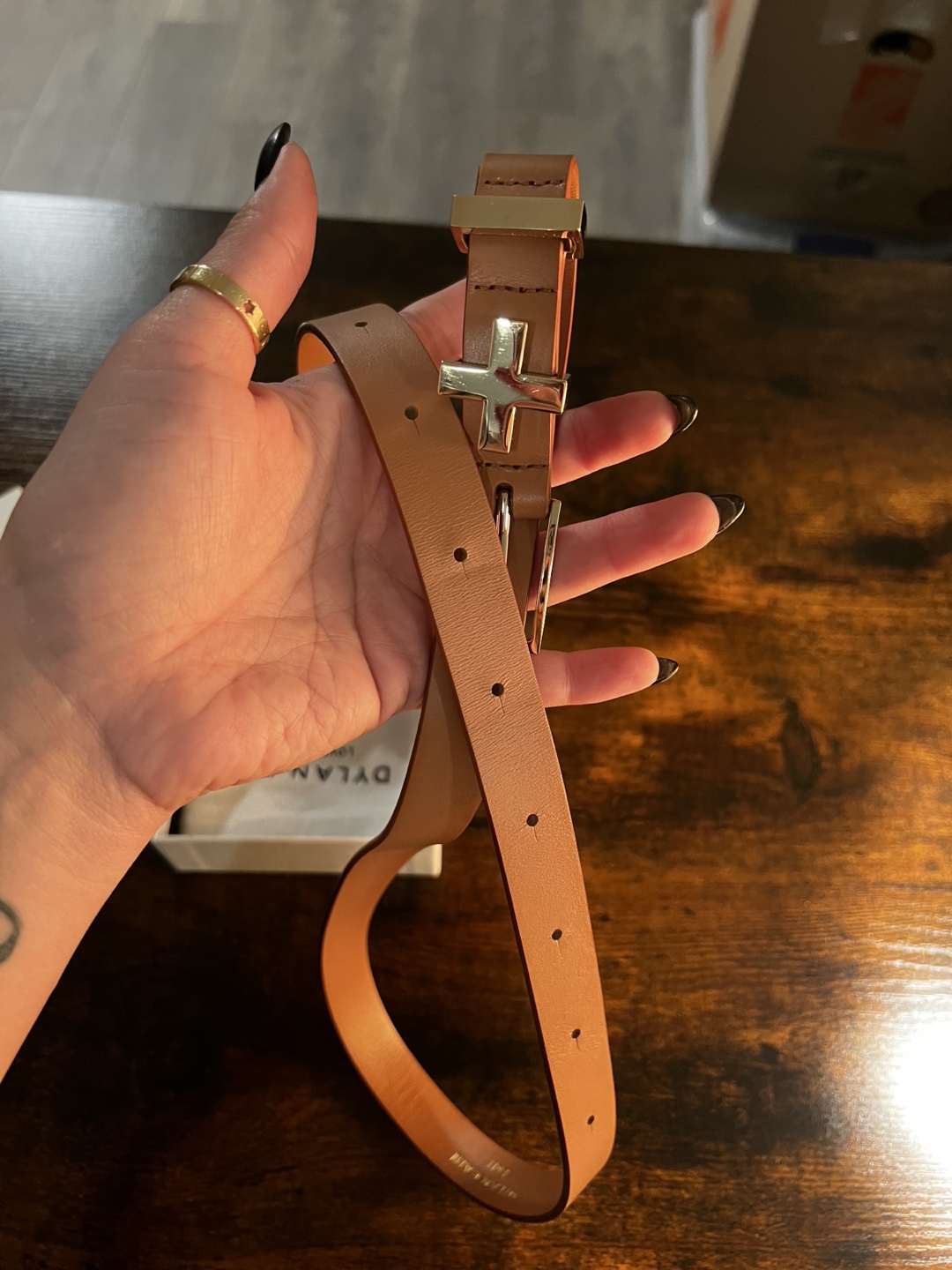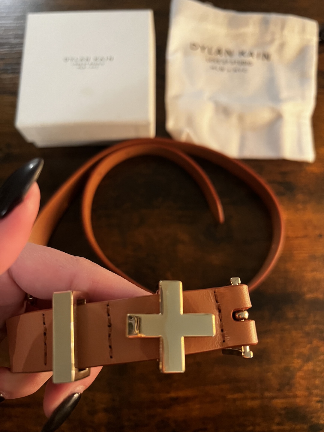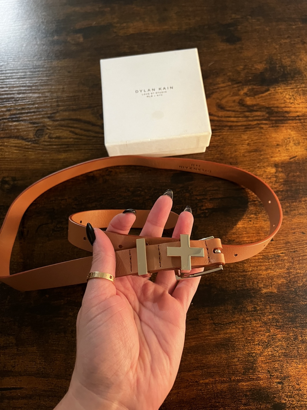 Selling a Dylan Kain belt from the Love St Studio collection! It's a beautiful light brown genuine leather belt with gold hardware in excellent condition. Comes with the original box and dust bag.