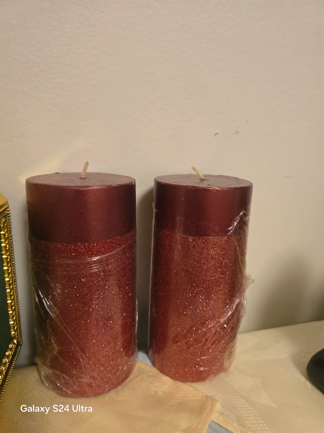 Two burgundy pillar candles with glitter detailing, still in their original wrapping! They would look great as a centrepiece or as part of a decorative display