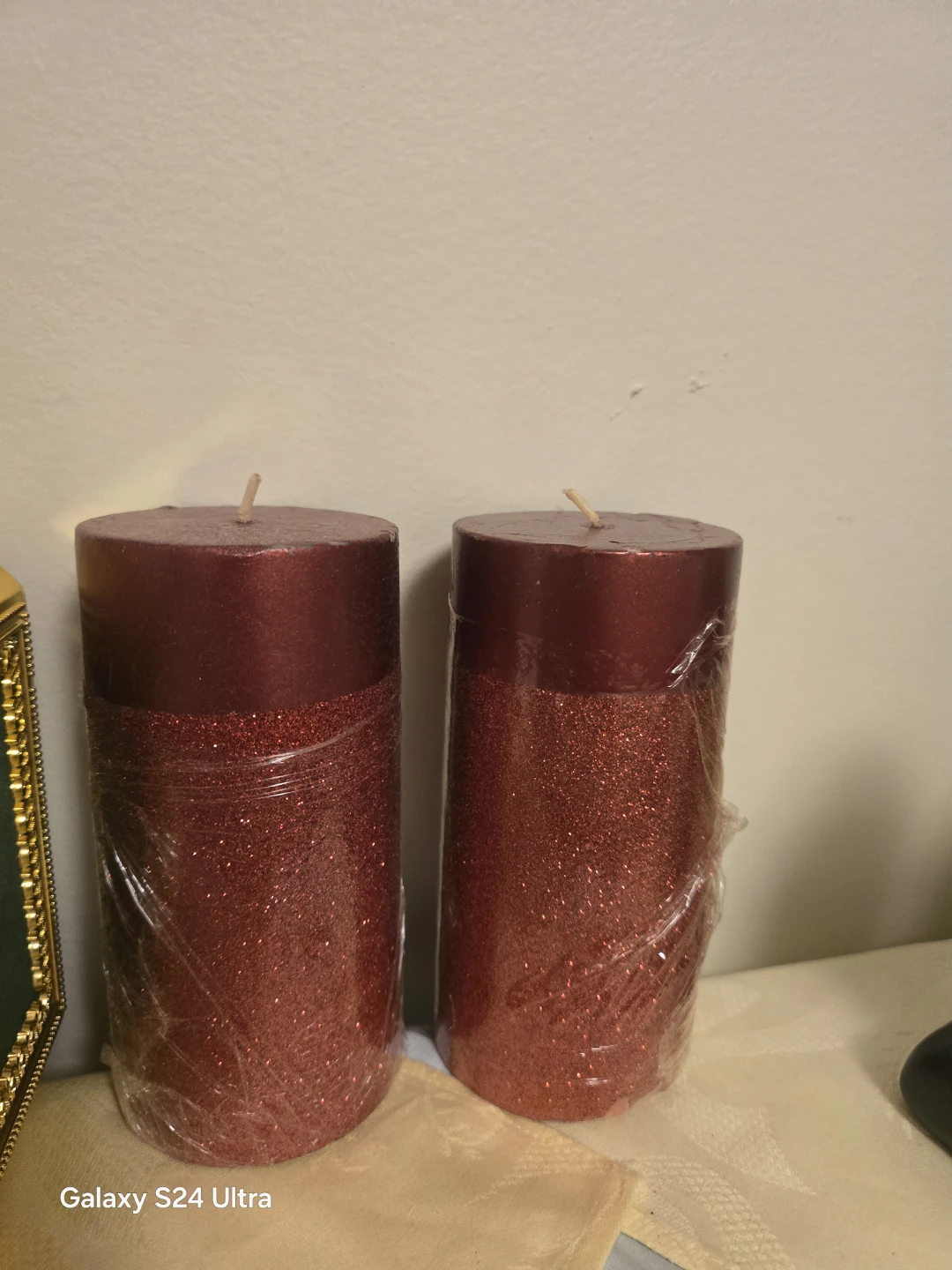 Two burgundy pillar candles with glitter detailing, still in their original wrapping! They would look great as a centrepiece or as part of a decorative display