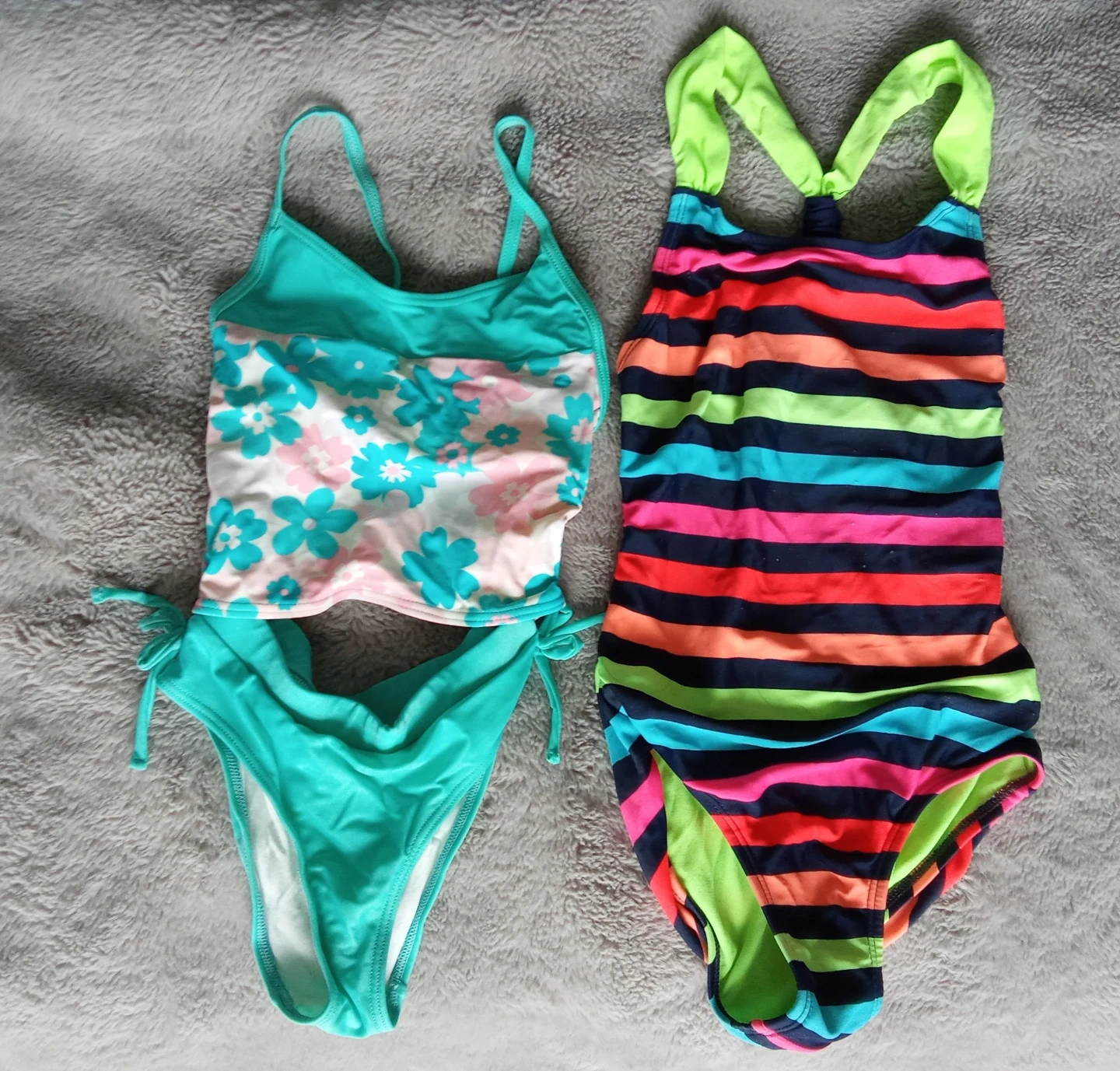 Two adorable swimsuits for your little one. One is a turquoise two-piece with a floral tankini top and tie sides. The other is a colourful striped one-piece with a cutout back. Perfect for a day at the beach or pool!