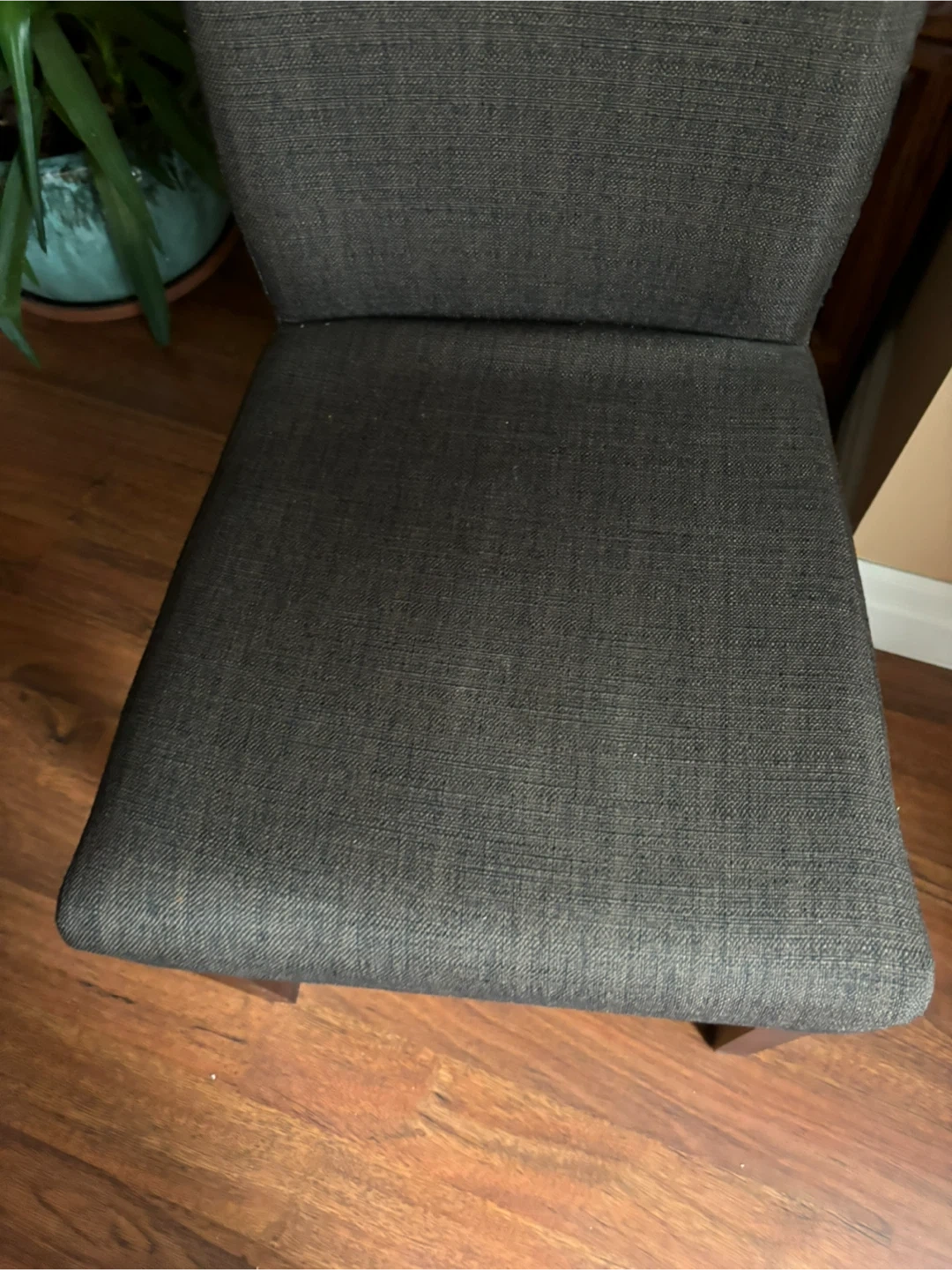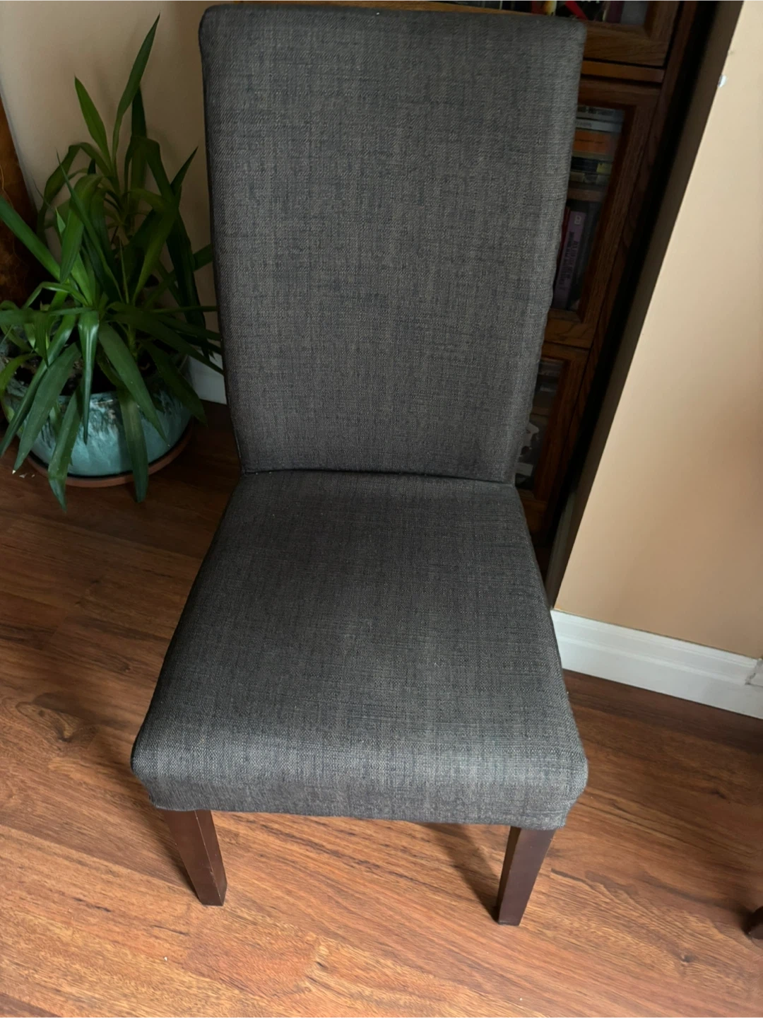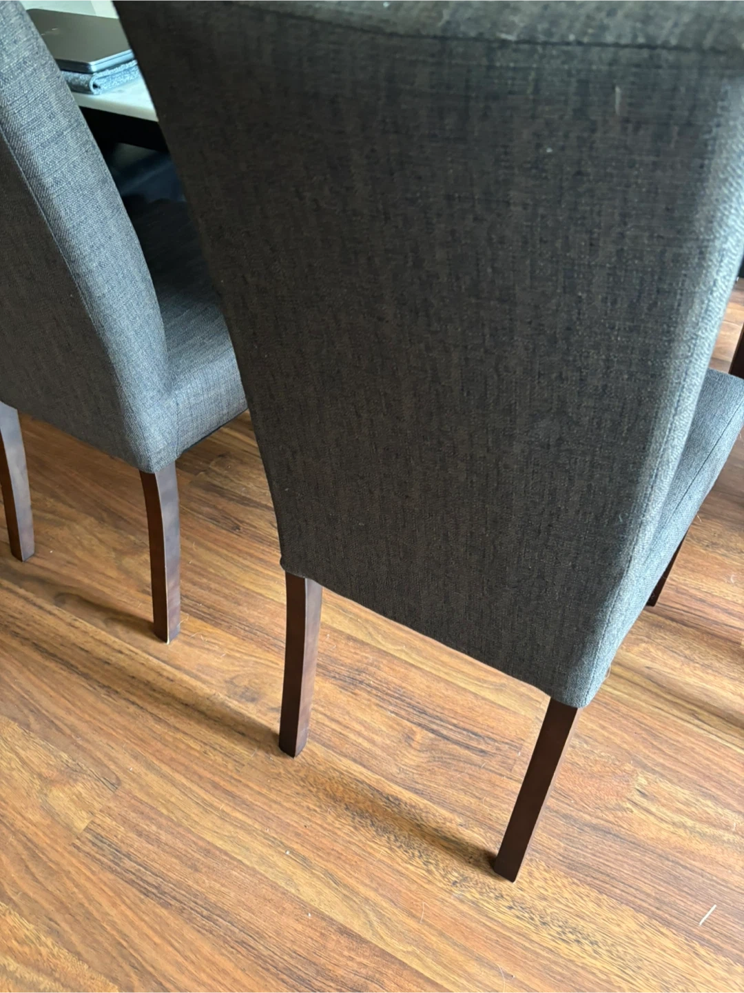 Set of four upholstered dining chairs with fabric covers. Wooden legs provide sturdy support. Fabric colour is a neutral brown. In excellent conditions.
