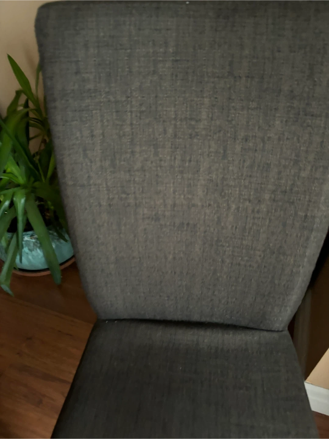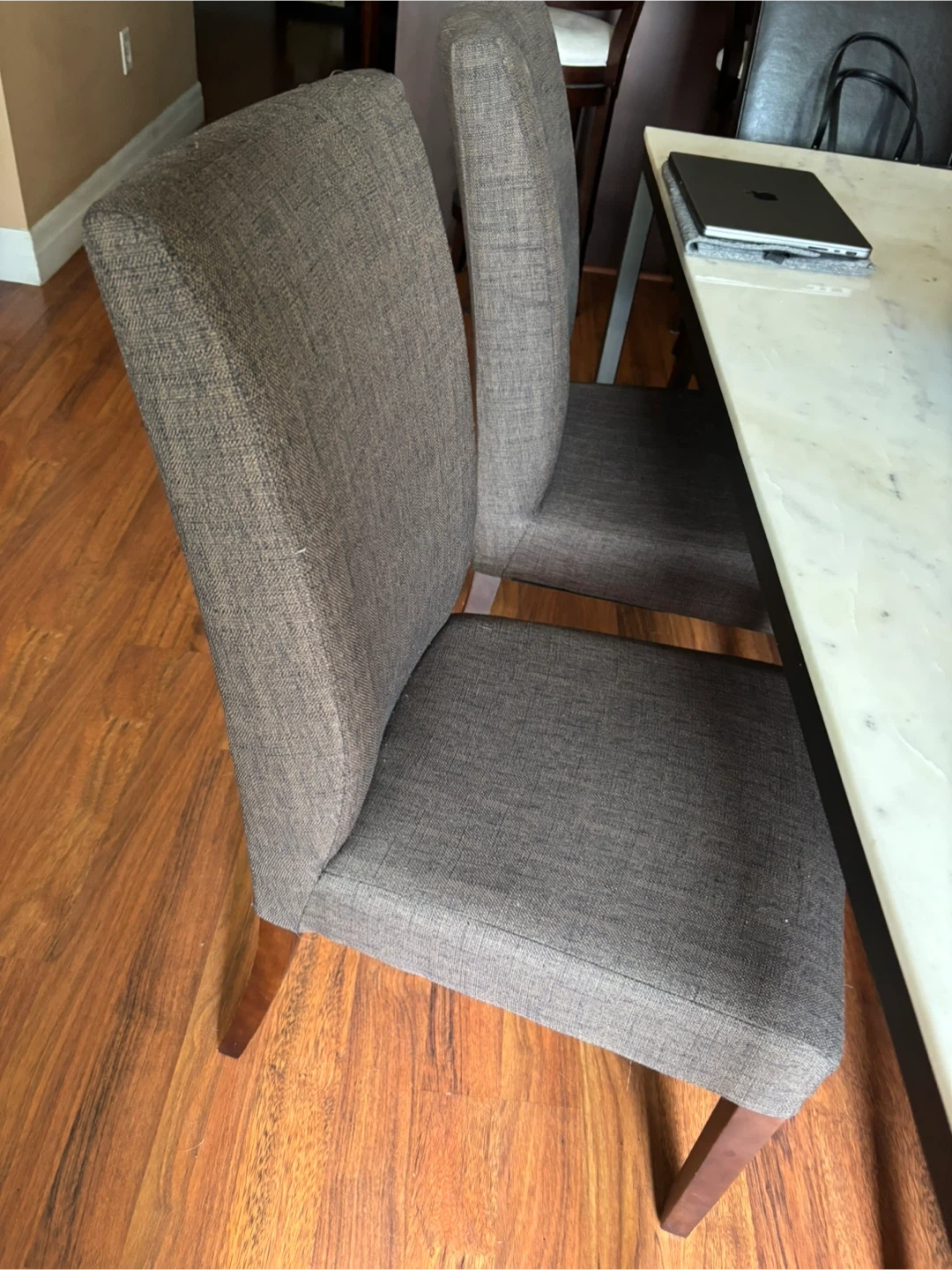 Set of four upholstered dining chairs with fabric covers. Wooden legs provide sturdy support. Fabric colour is a neutral brown. In excellent conditions.