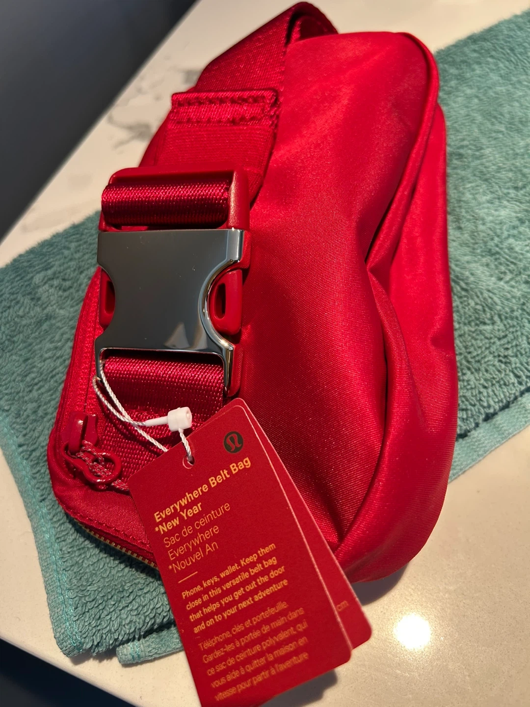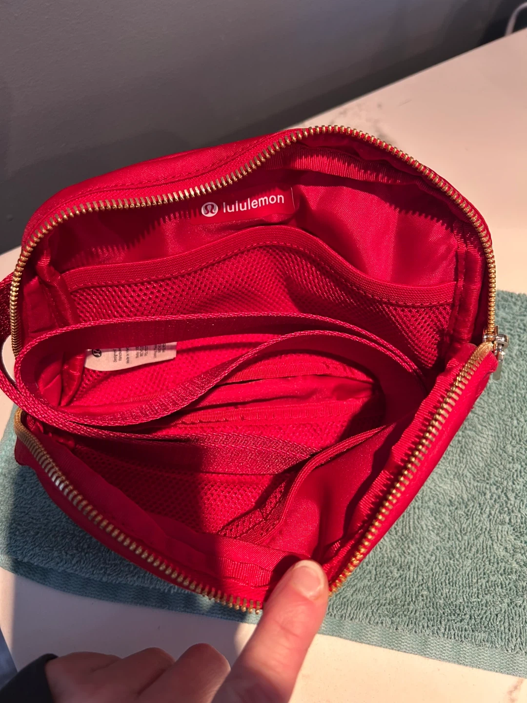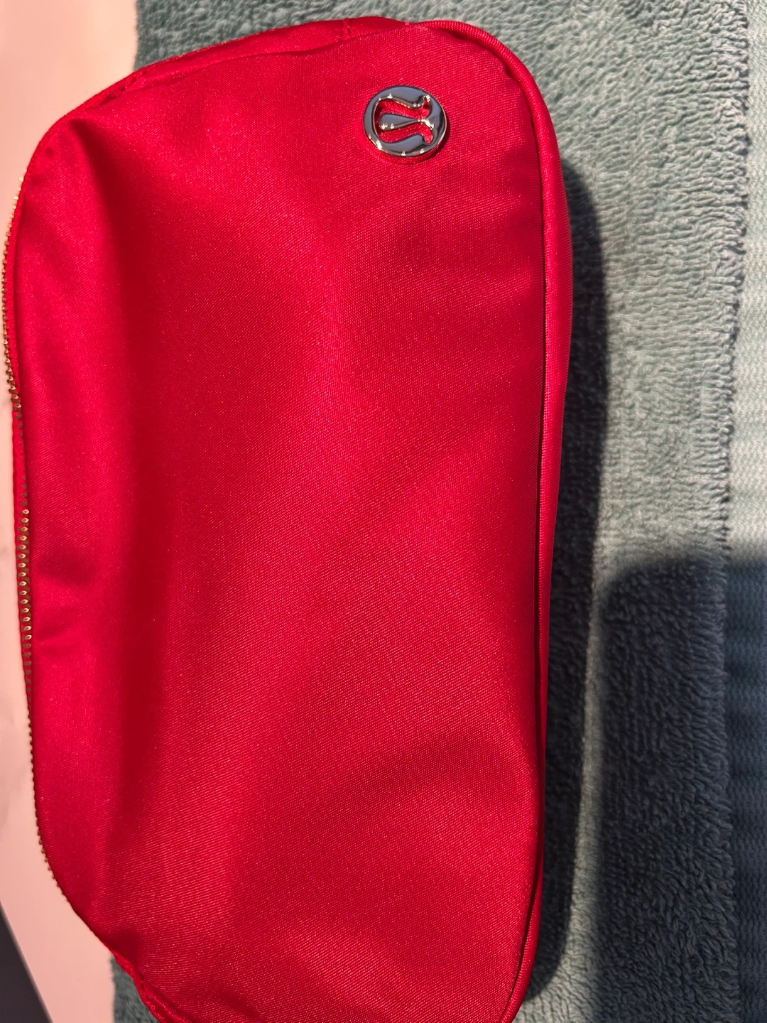 This Lululemon Everywhere Belt Bag is in a vibrant red colour. It's perfect for keeping your phone, keys, and wallet handy while you're on the go. The bag features multiple interior pockets for organization.