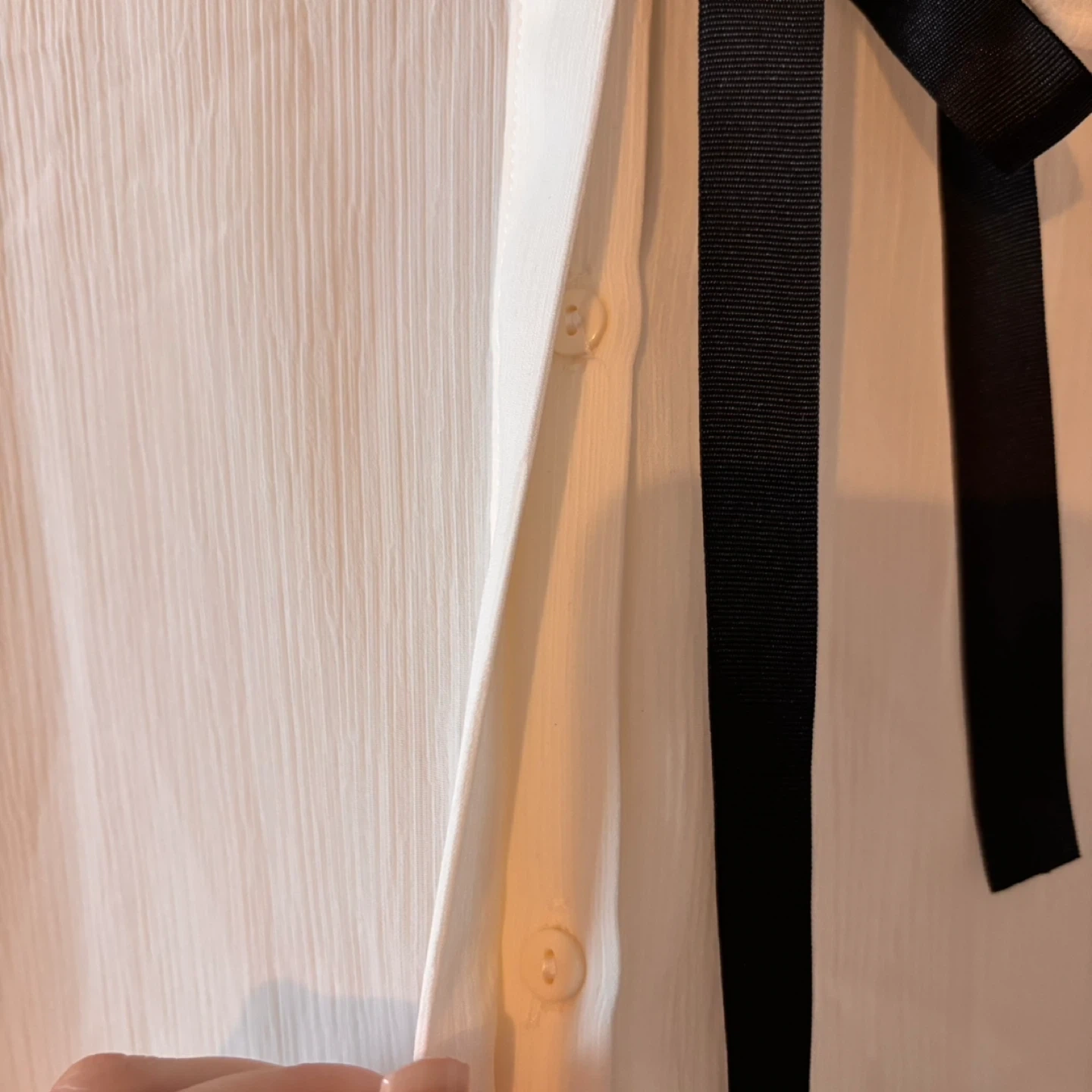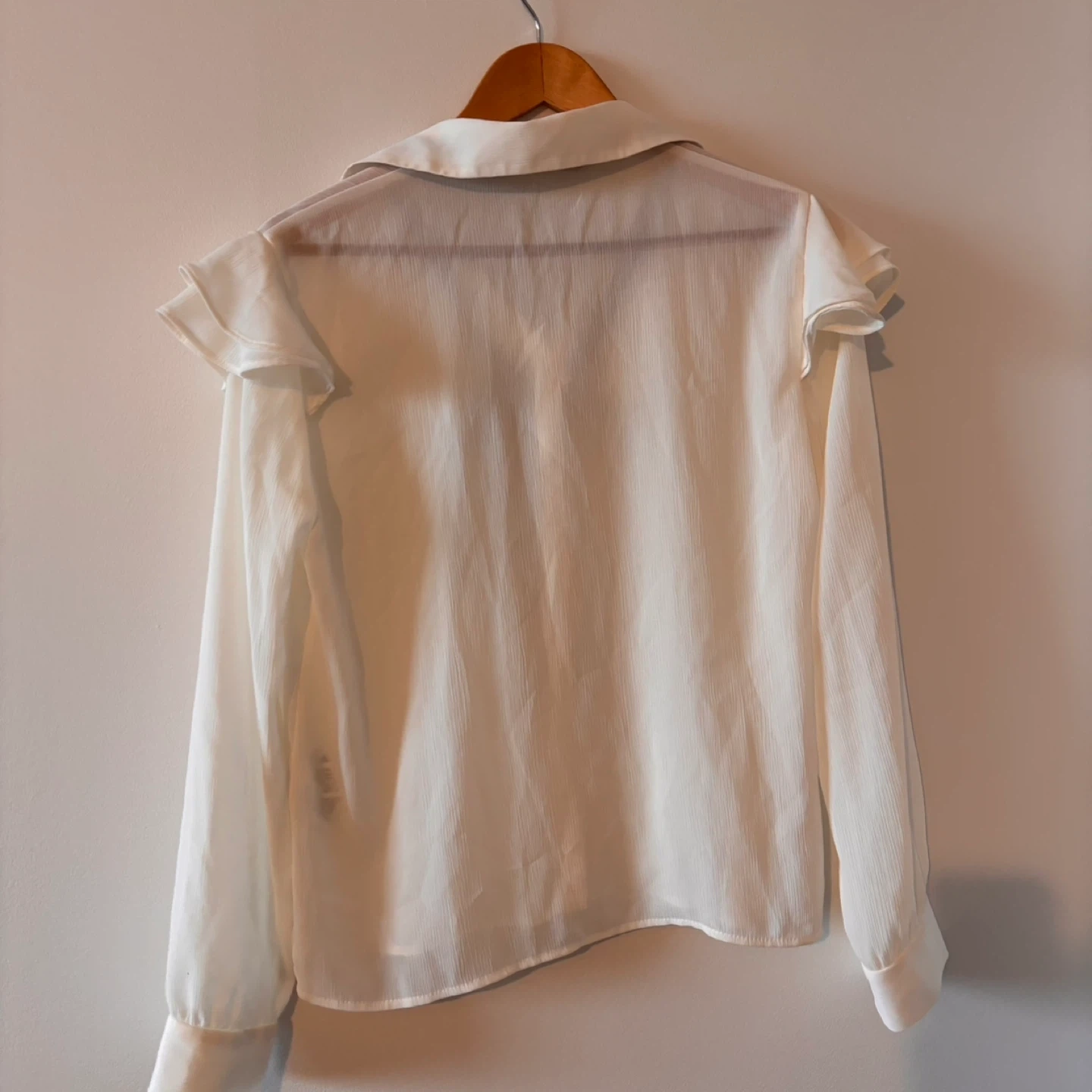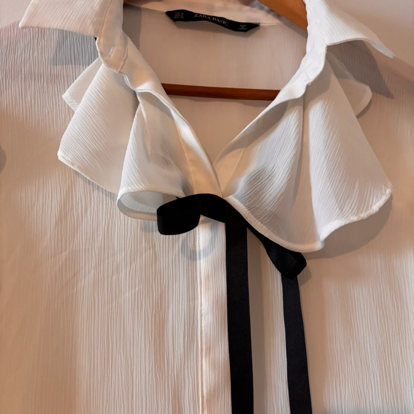 Sheer white long-sleeved blouse from Zara Basic. It has a ruffled collar and a black ribbon tie. Material is lightweight and flowy. Size M.