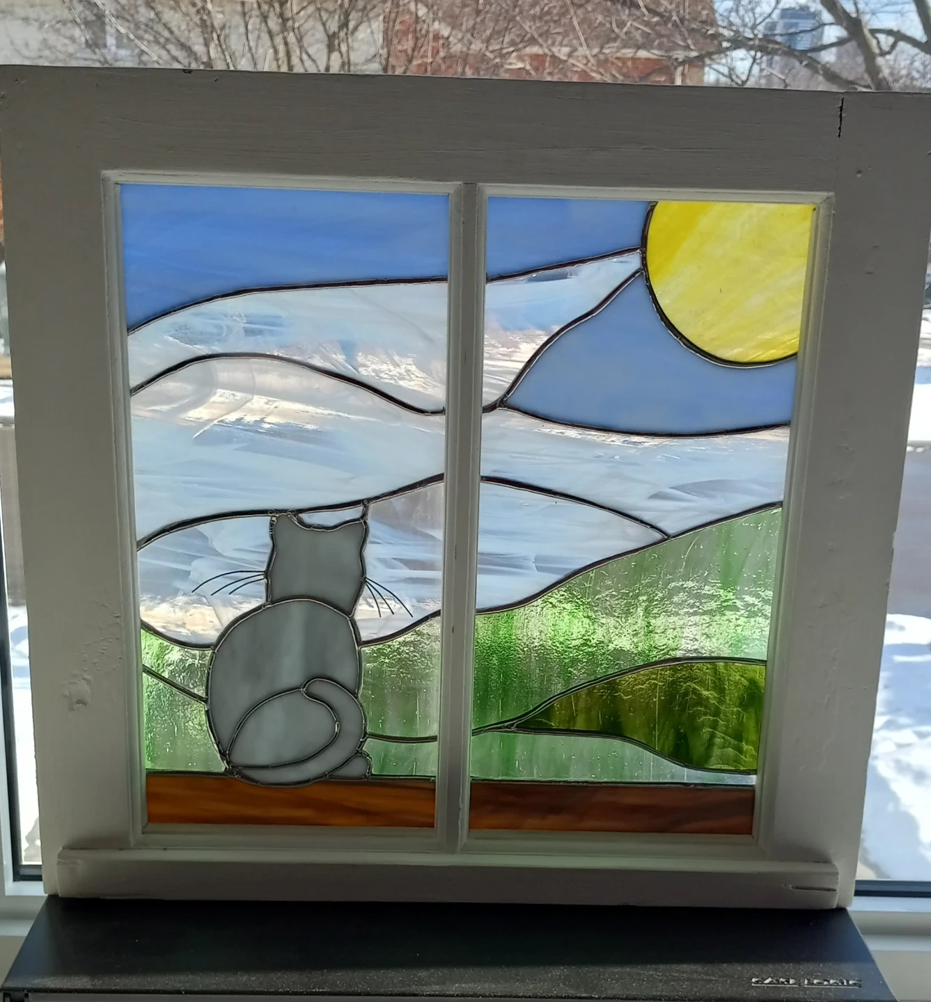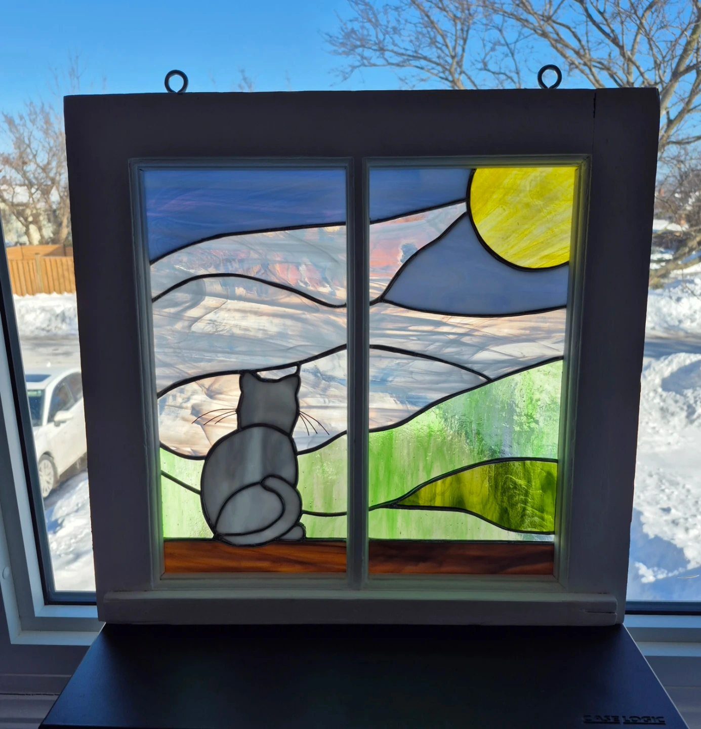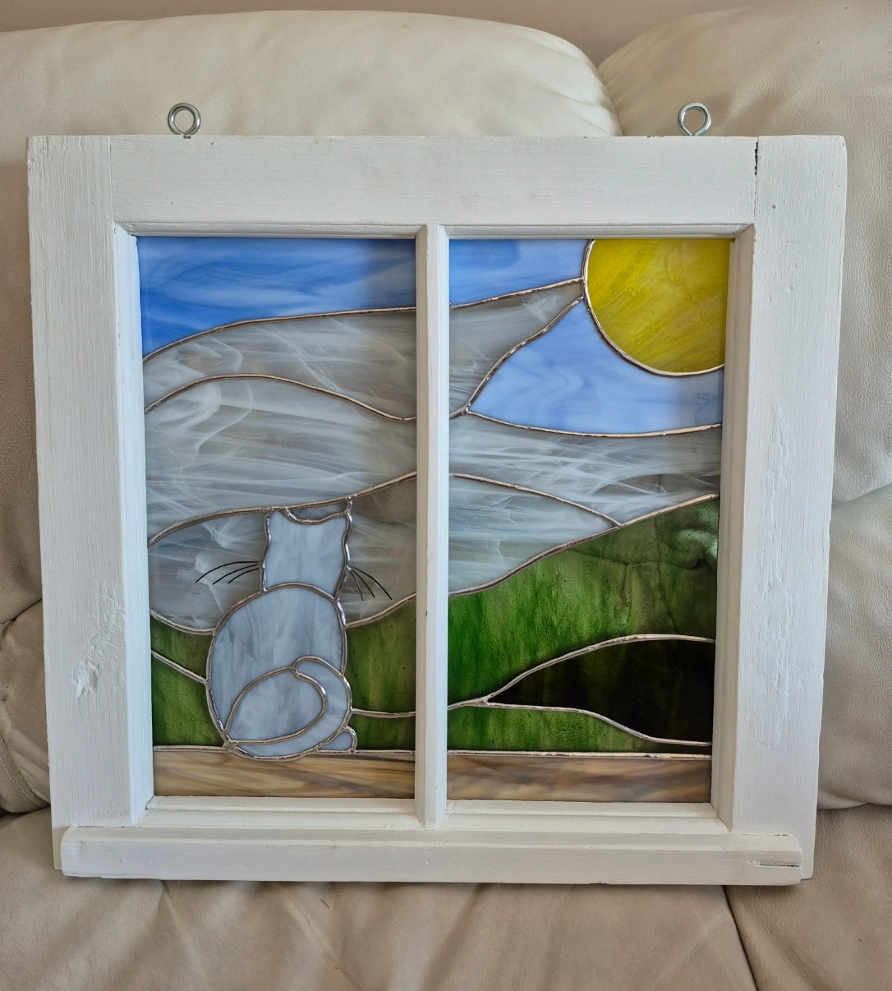 Hand designed and crafted stained glass window. Vintage white refinished wooden frame with rings for hanging. New handcrafted panels copper foiled and soldered glass held in with points and window glazing. Different t textures and colour's of glass, beautiful in sunlight. Frame size 17 H by 18 W inches.