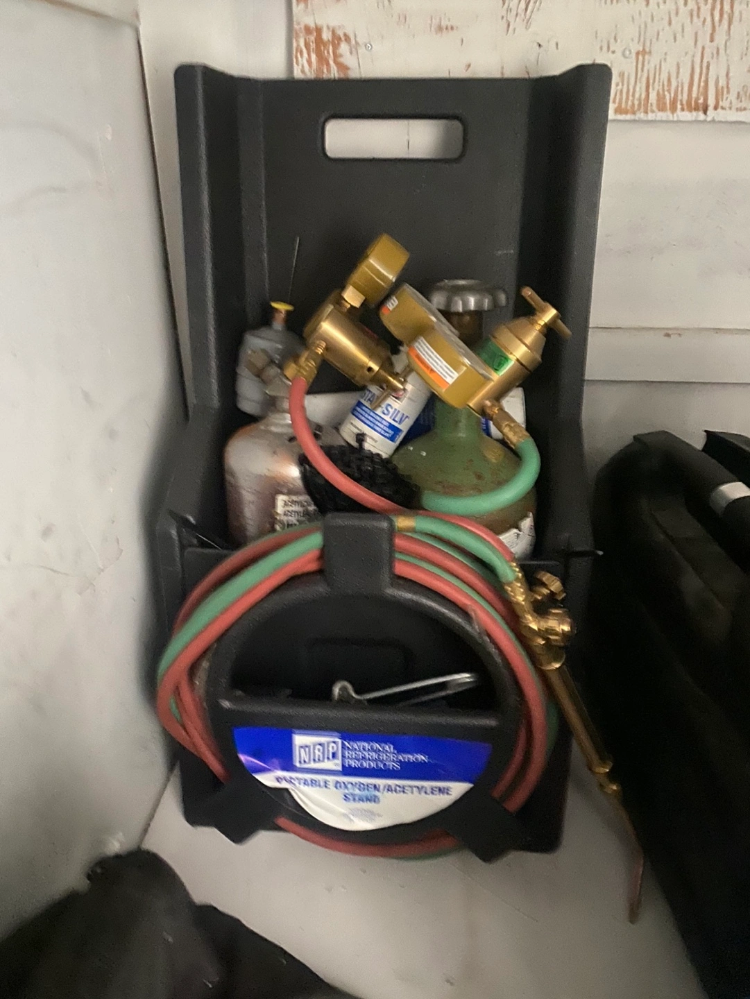 Portable oxygen/acetylene stand. Includes various welding equipment and hoses. NRP brand stand.