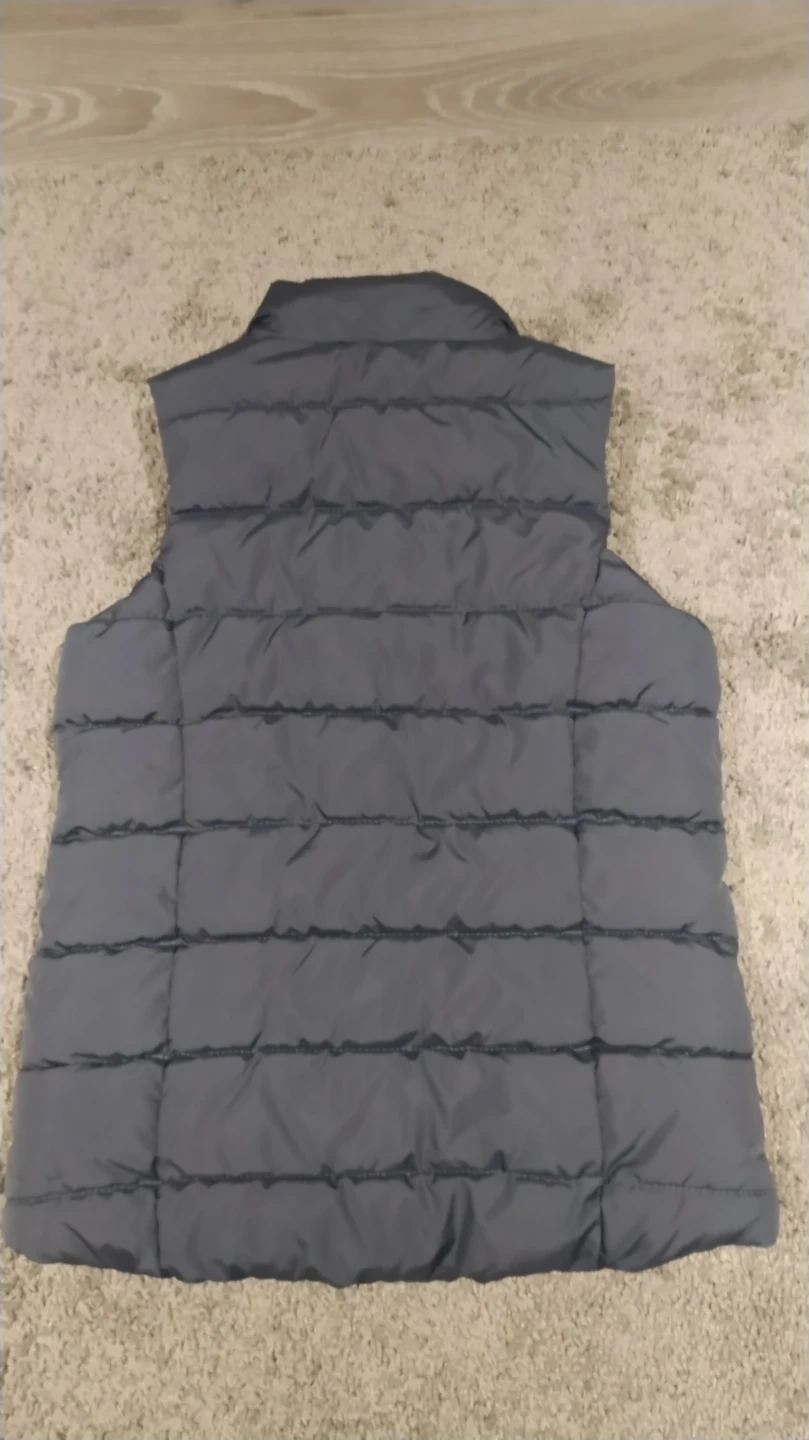 This is an Old Navy Frost Free puffer vest. It's a girls' size medium, which is equivalent to a size 8. The vest is grey with a pink loop inside for hanging.