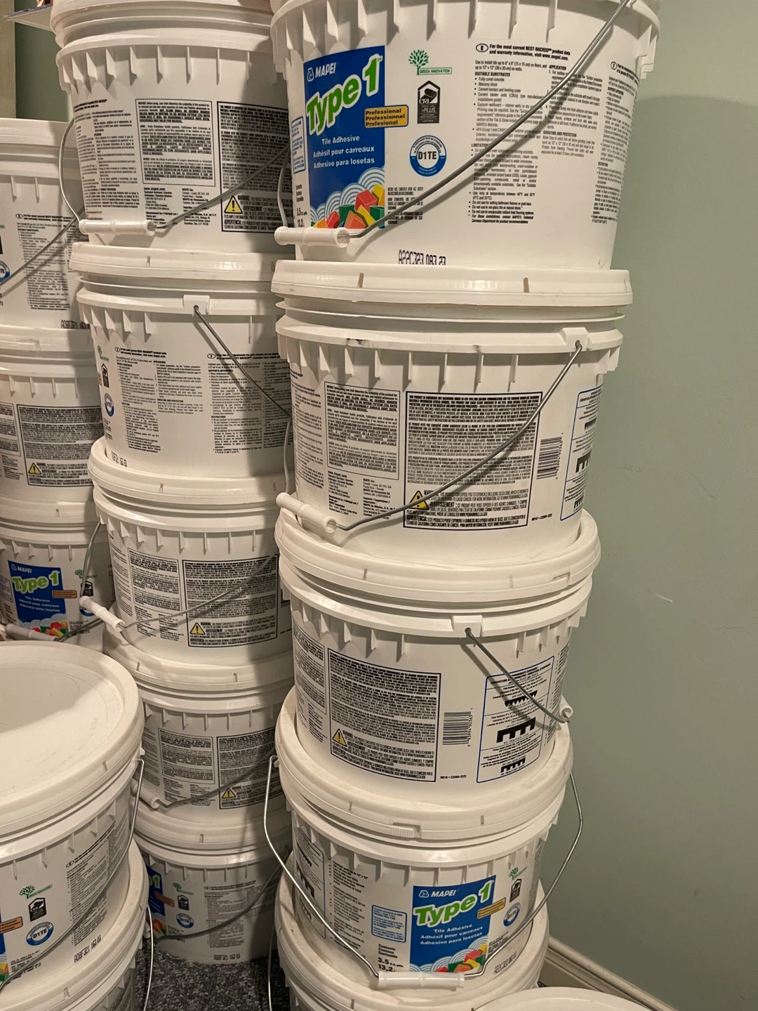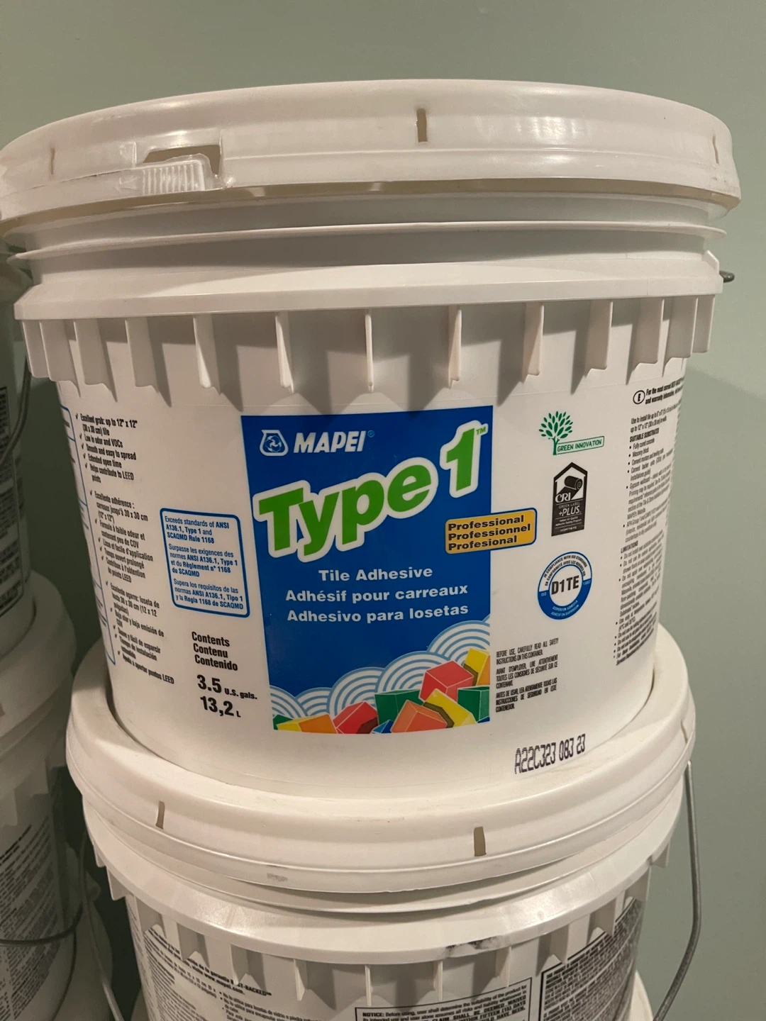 Selling buckets of Mapei Type 1 Tile Adhesive. Each bucket contains 3.5 U.S. gallons (13.2L). Perfect for tile installation projects! Available for pickup