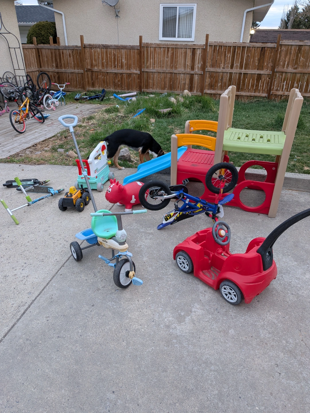I am selling these used kids toys in a bundle. They have been outside for a while but they are still in good condition. The bike needs the front mud flap tighten see what is in the pictures is what's for sale price is negotiable