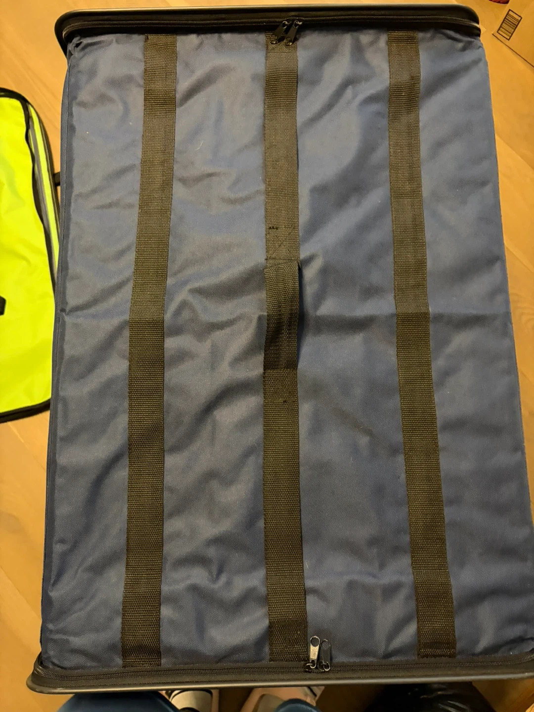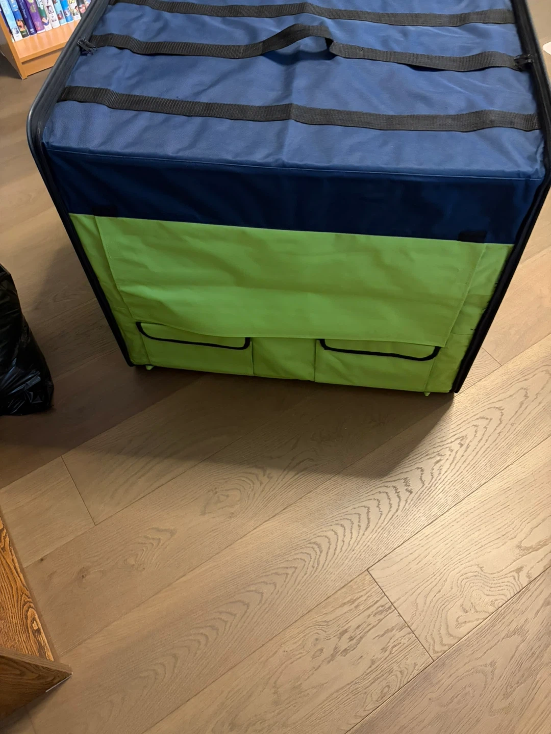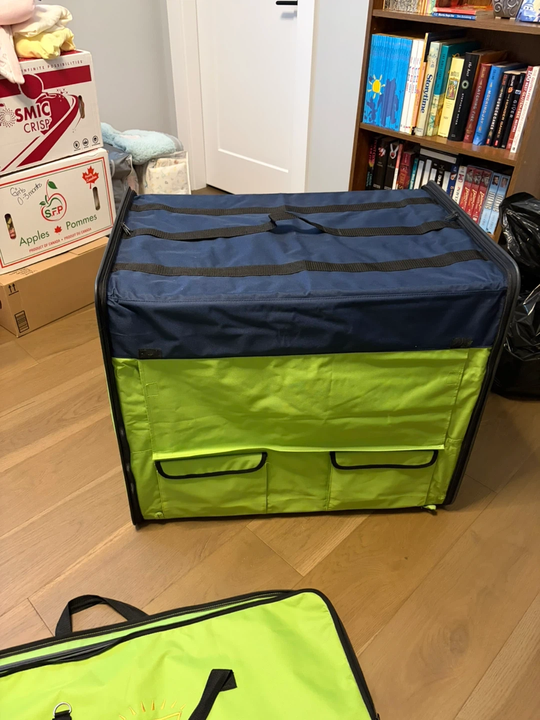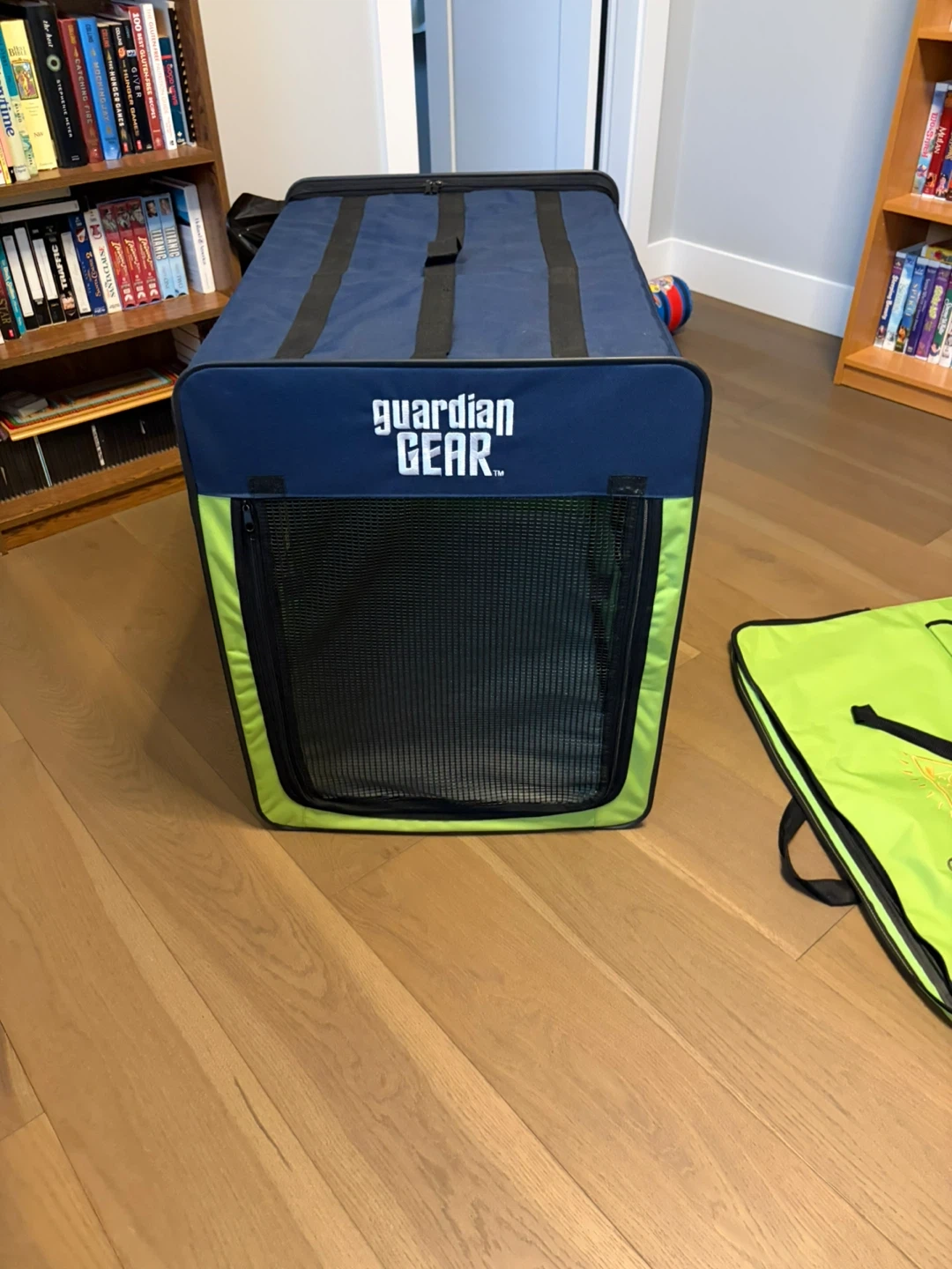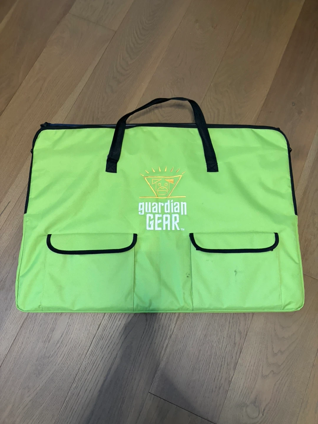 This is a blue and green Guardian Gear soft-sided pet carrier. It's made of durable fabric with mesh ventilation panels. It also includes a foldable mat that zips into a separate carrying case. Great if for transporting pets safely!